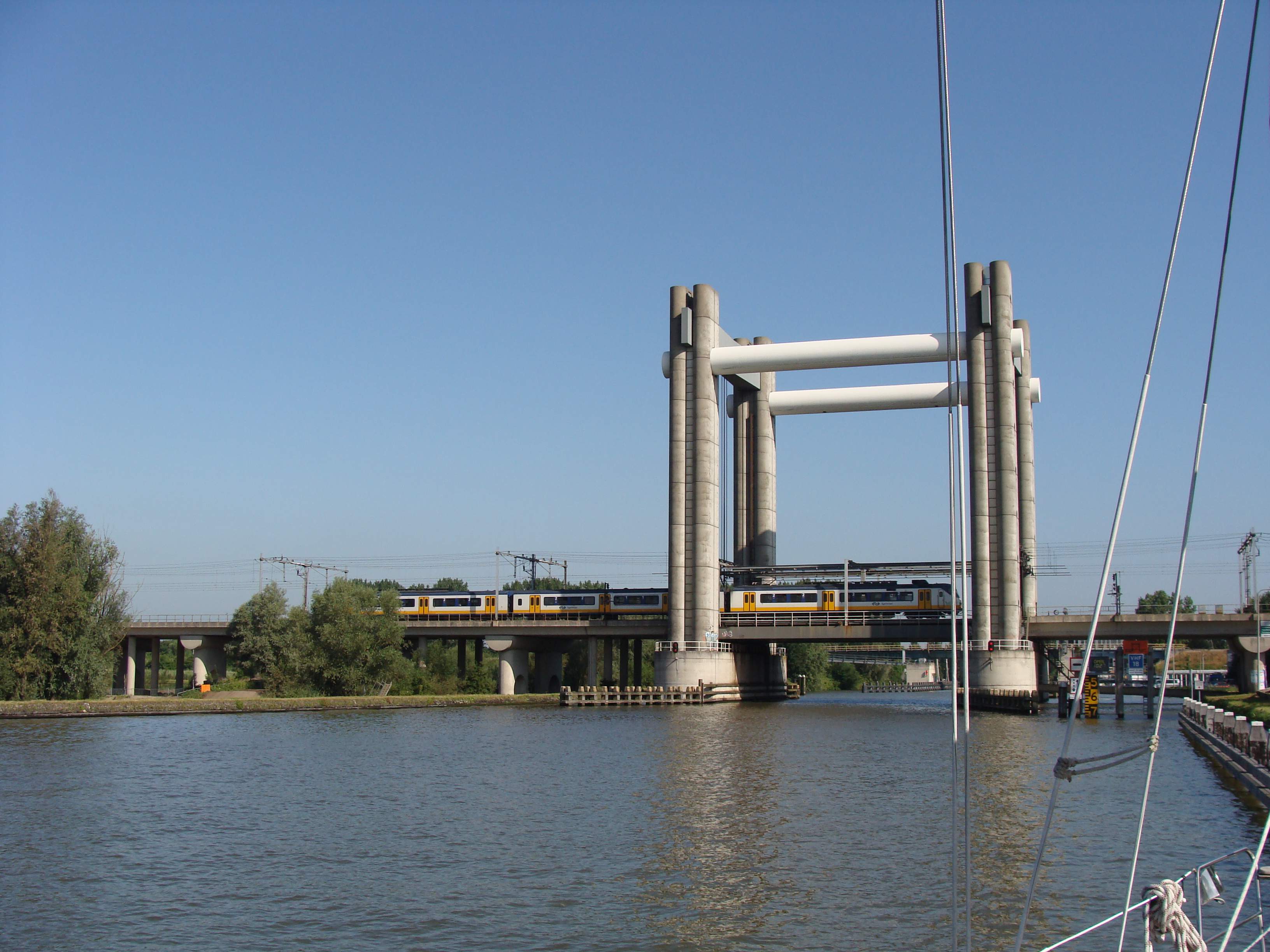 Kurz vor 10 Uhr 27 lösten all die kleinen Segelboote am Wachtsteiger vor der Eisenbahnbrücke in Gouda die Leinen, um sich schon mal davor anzustellen. Doch mein Blick zurück traf nicht Tomys Nicken, mit dem er mir „Leinen los“ signalisiert: