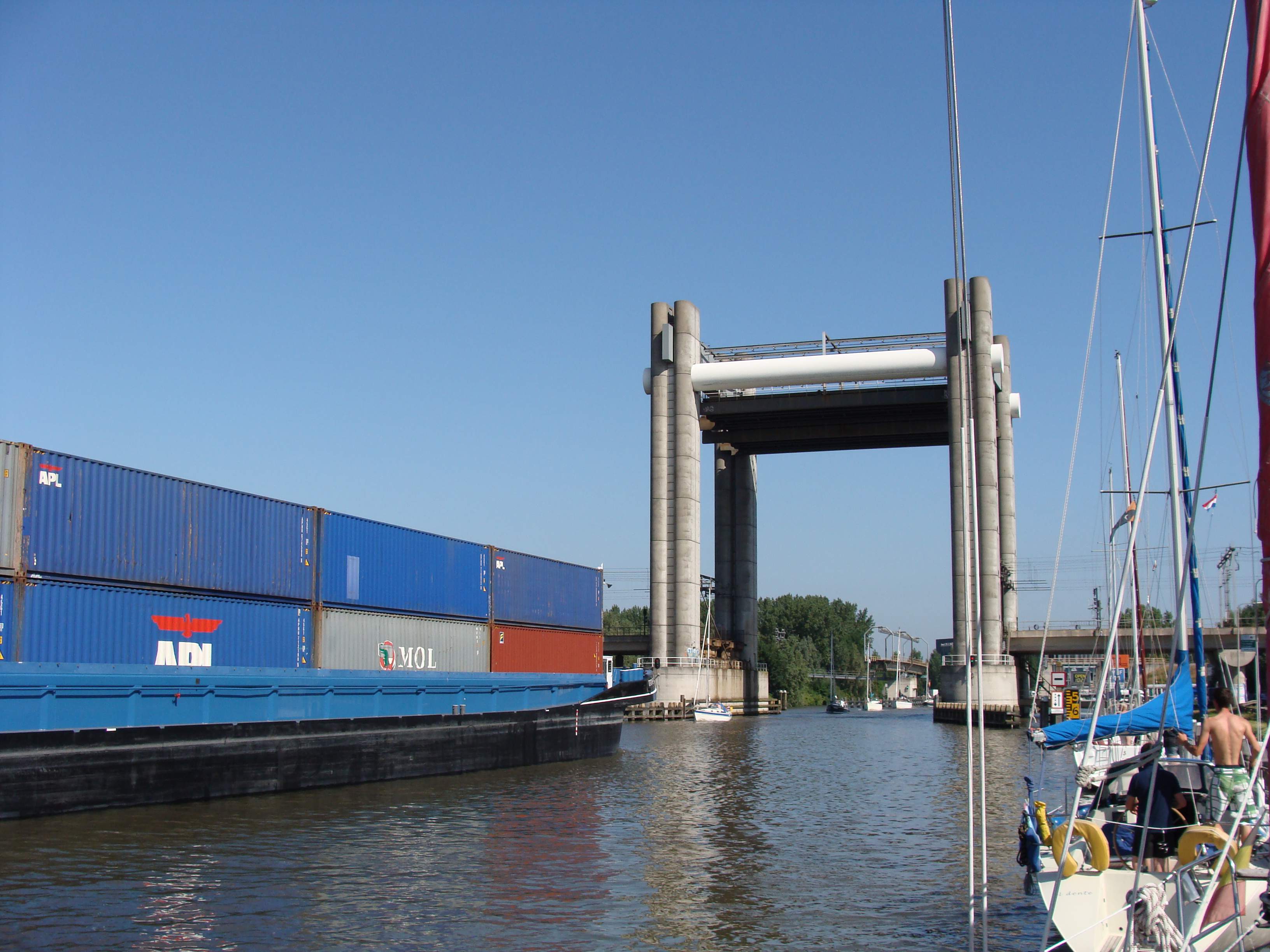 TORMENTA schob mit einiger Geschwindigkeit auf die noch geschlossene Brücke zu – genau abgepasst ging sie auf, der Frachter durch und 5 oder 6 Segler hinterher. So kamen wir diesmal flott durch alle Brücken bis Alphen am Rijn! Hinter dem Braassemermeer bogen wir rechts ab Richtung Westeinder Plassen, Aalsmeer und Amsterdam.