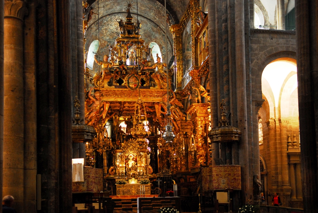 Wir belassen es dabei, die Kirche zu bewundern, ein erhabenes, schlichtes Bauwerk, in das irgendwann ein riesiges barockes Altarbild mit dem Apostel Jakob/Santiago gepresst wurde. Der Botafumeiro, das größte Weihrauchfass der Welt, wird heute nicht geblitzt: Mit 68 Km/h schwingt es an Feiertagen durch die Kirche. An den Rändern stehen alte Beichtstühle, in denen in so ziemlich allen Sprachen Europas gebeichtet werden kann, kniend, so wie ich das aus meiner Kindheit kenne. In den seitlichen Kapellen werden Andachten und Messen in verschiedenen Sprachen gehalten. Die Polen singen besonders schön – ihnen zuzuhören ist erhebender als alles andere.