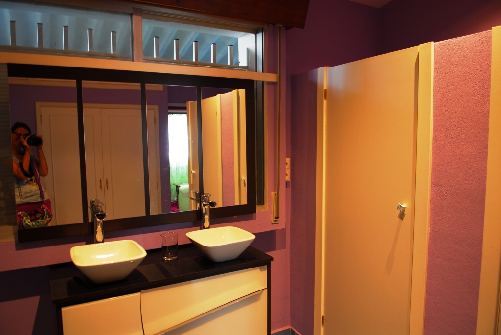 Lila! Das Badezimmer ist lila, lila wie unser Gästezimmer, mit Schränken ähnlich Ikea und liebevollen Details. Es gibt eine, nein ganze zwei, regulierbare Regenduschen, mit Massagedüsen. Ich fühle mich fast wie zu Hause! Das Marinabüro in Muros sieht mehr wie ein Wohnhaus als ein Büro aus, mit gemütlichem Wohnzimmer, Küche mit Waschmaschinen und einem liebevollen kleinen Garten. Welch ein Kontrast zu den Sanitäranlagen in Camaret sur Mer!