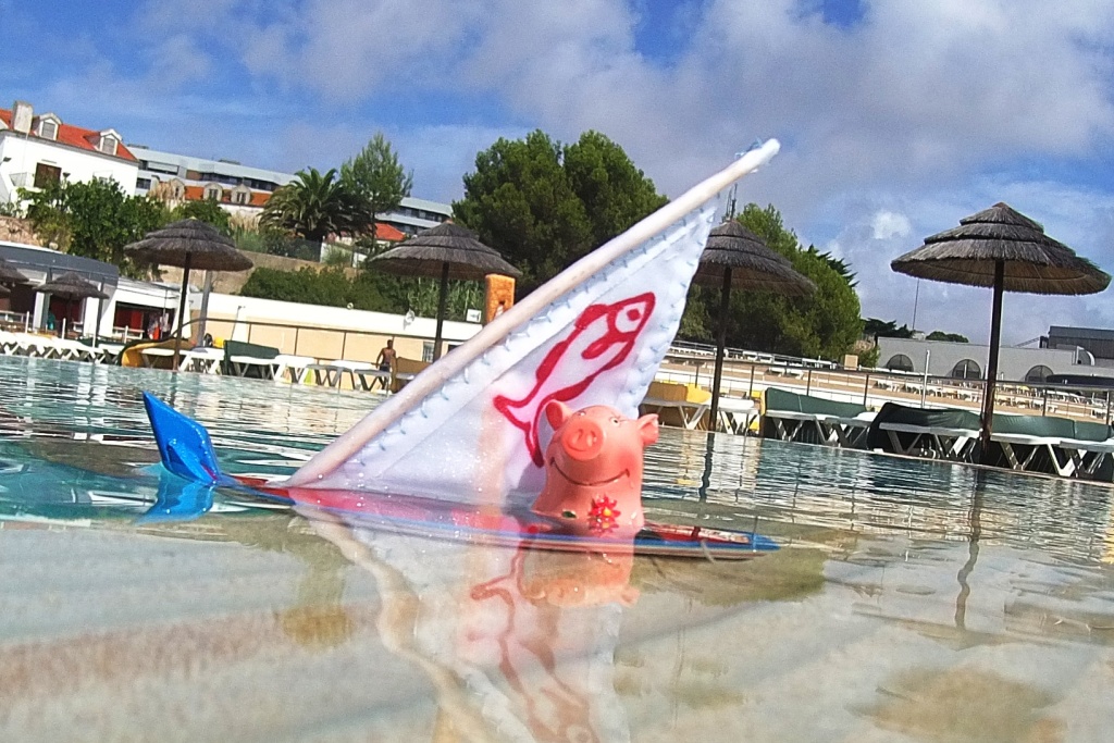 Wir könnten Gustav doch segeln und schwimmen beibringen! Das Schwimmbad haben wir ja jetzt, da es für die Öffentlichkeit geschlossen ist, für uns allein!