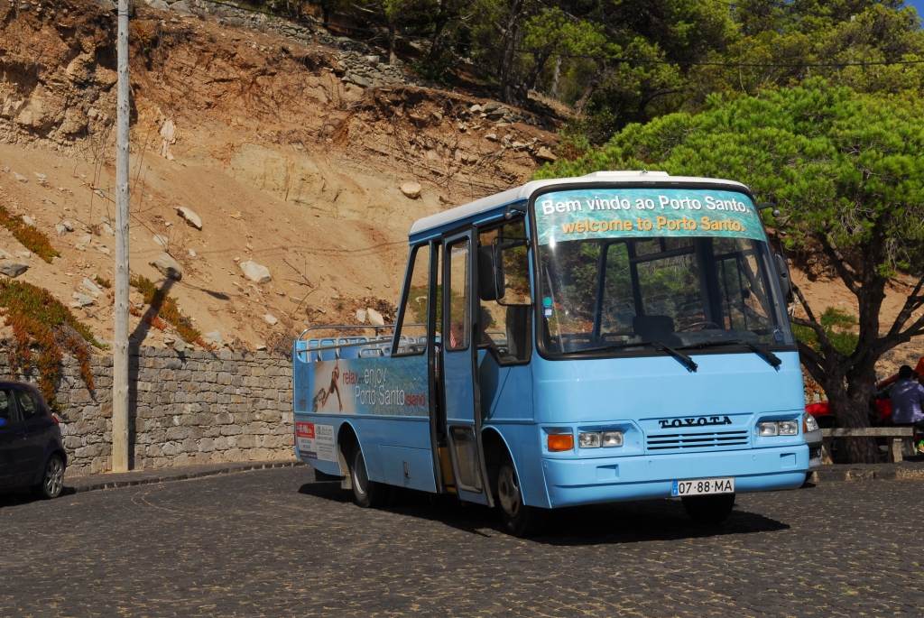 Am Nachmittag fahren wir mit dem offenen Touristenbus rund um die Insel. Links ist der Strand hinter den kleinen Dünen mit Strandbars und schönen Hotelanlagen. Im Pestana Porto Santo kann man sicher gut Urlaub machen! Am westlichen Ende liegt ein romantischer Strand mit Felsen, Steinen, Sand und kleinen Pools. Es geht zurück und diesmal fallen uns mehr die Villen und Häuschen auf der Landseite auf. Bald biegen wir links ab, hinauf auf den Berg, vorbei an weißen Häuschen mit Bougainvilleen, Hibiskus, Oleander, Kakteen, Strelitzen und anderen Blüten. Auf der Ebene oben liegen Felder, abgeteilt mit Steinmauern aus Lavastein, errichtet wohl auch, um das Wasser zu halten. Denn überall dort, wo keines ist, liegt Mutter Erde nackt und ungeschützt da, um nicht zu sagen: verletzt. Porto Santo war einst so dicht mit Drachenbäumen bewachsen, dass die Entdecker nicht mal an Land gehen konnten! So brachten sie Schweine mit, die erst mal das Unterholz begehbar machten. Heute ist die Insel blankgerodet und wird mühsamst wieder aufgeforstet und begrünt.