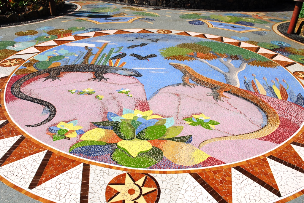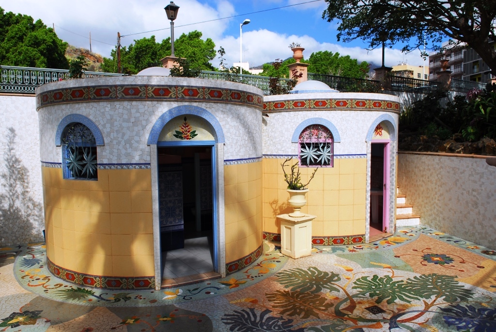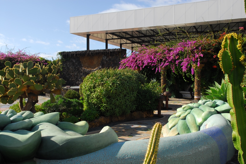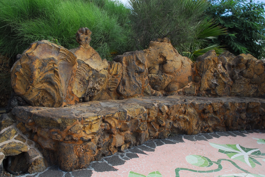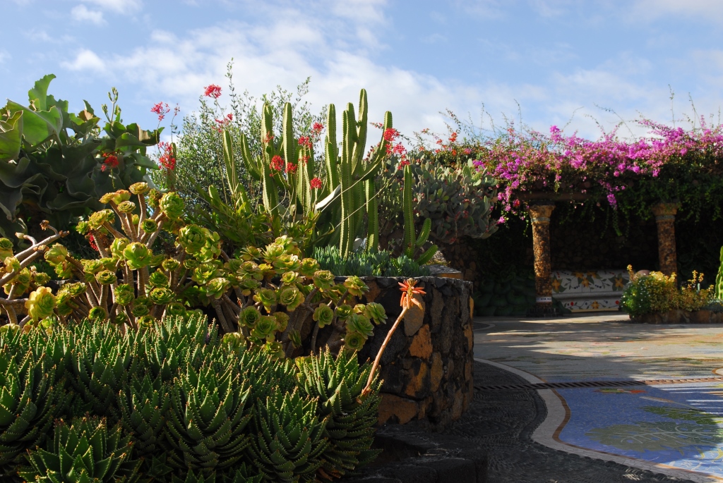 Ein von Luis Morera fantasievoll gestalteter Dorfplatz, mit buntem Mosaik, lauschigen Bänken unter magentafarbenen Bougainvilleen und einem Garten voller schön gewachsener Sukkulenten.