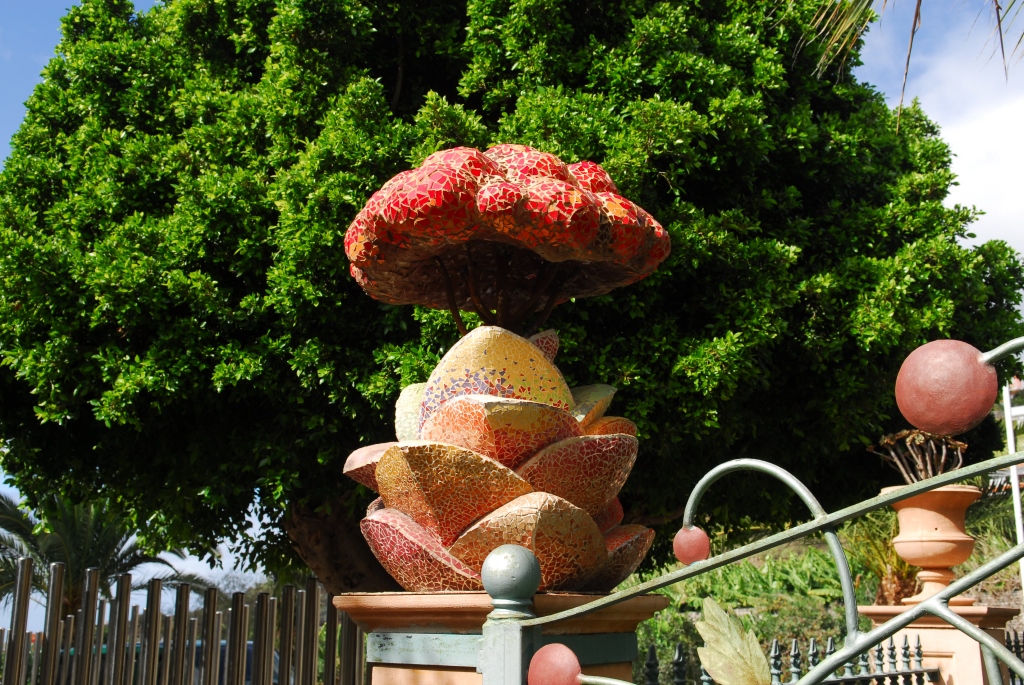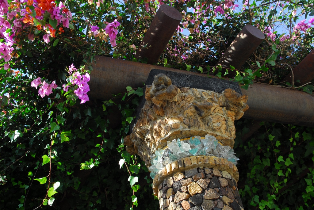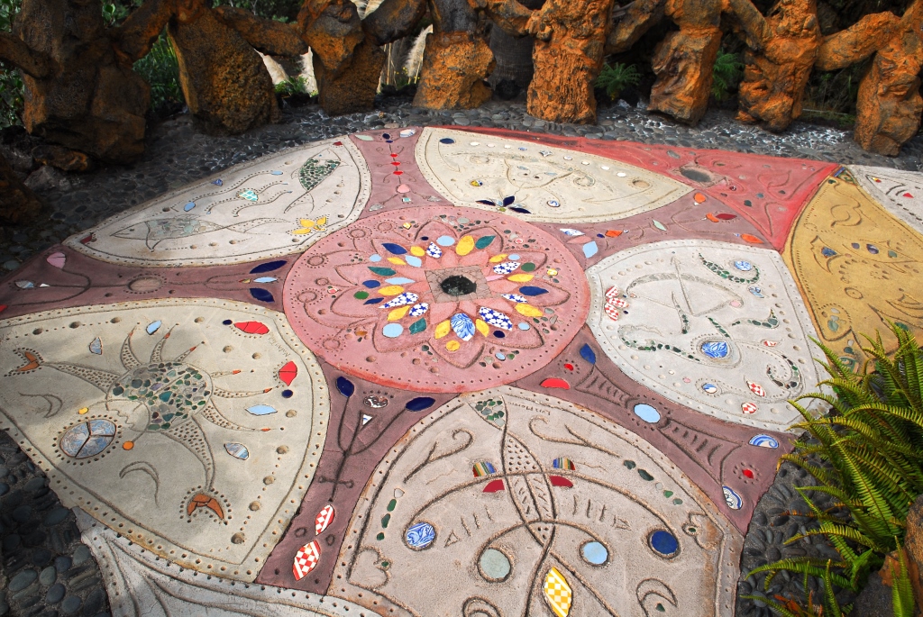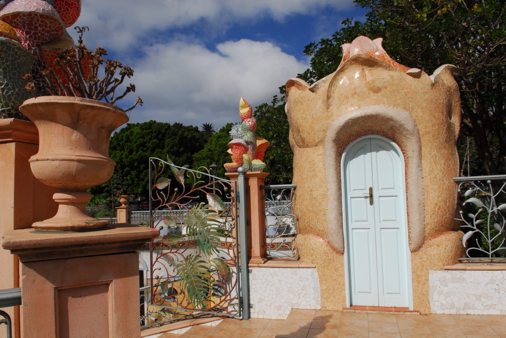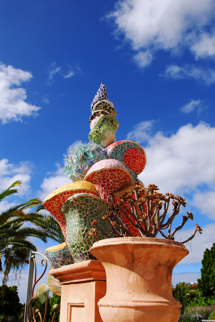 Ein von Luis Morera fantasievoll gestalteter Dorfplatz, mit buntem Mosaik, lauschigen Bänken unter magentafarbenen Bougainvilleen und einem Garten voller schön gewachsener Sukkulenten.