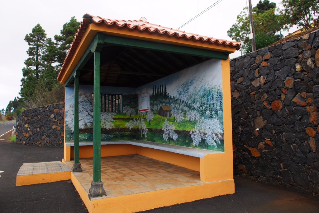 Auffallend sind die Haltestellen des Guagua, eine Verballhornung von englischen „wagon“. Sie sind fast alle einheitlich gestaltet, ein kleines gelbes Häuschen mit Dach. Manche sind innen oder außen mit Szenen aus La Palma oder mit Gedichten bemalt. Wenn dann der Bus noch pünktlich ist, lacht das Herz noch mehr!