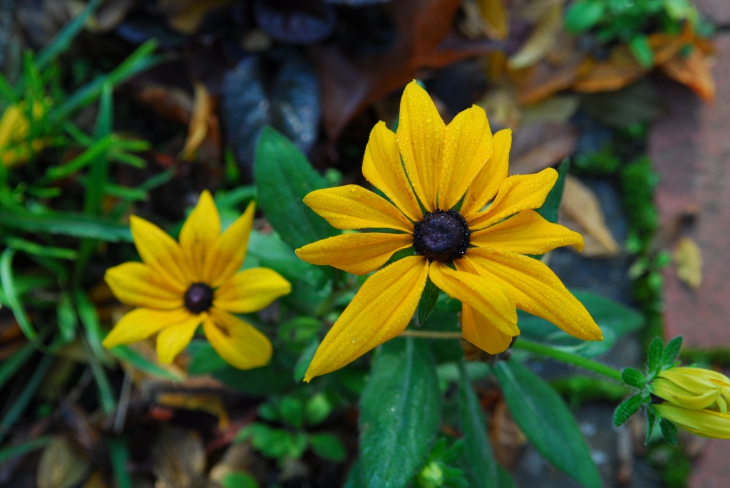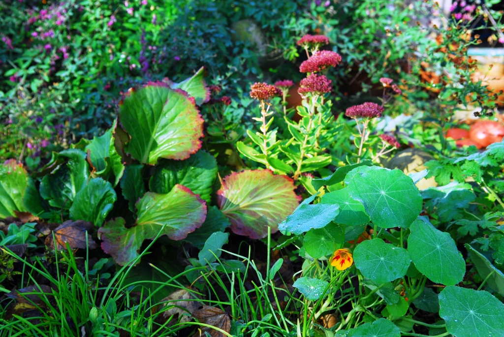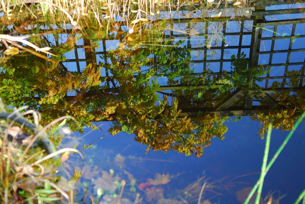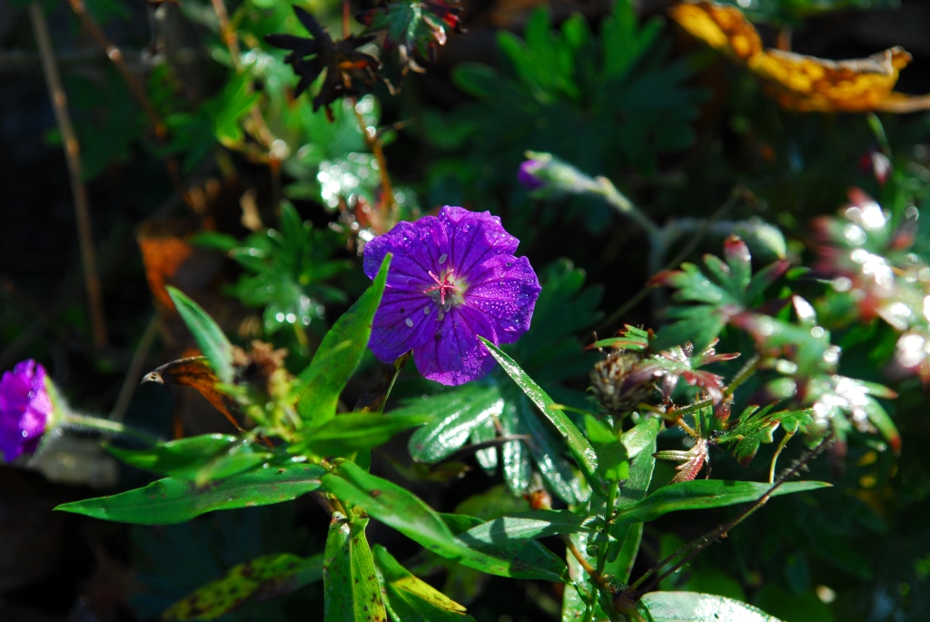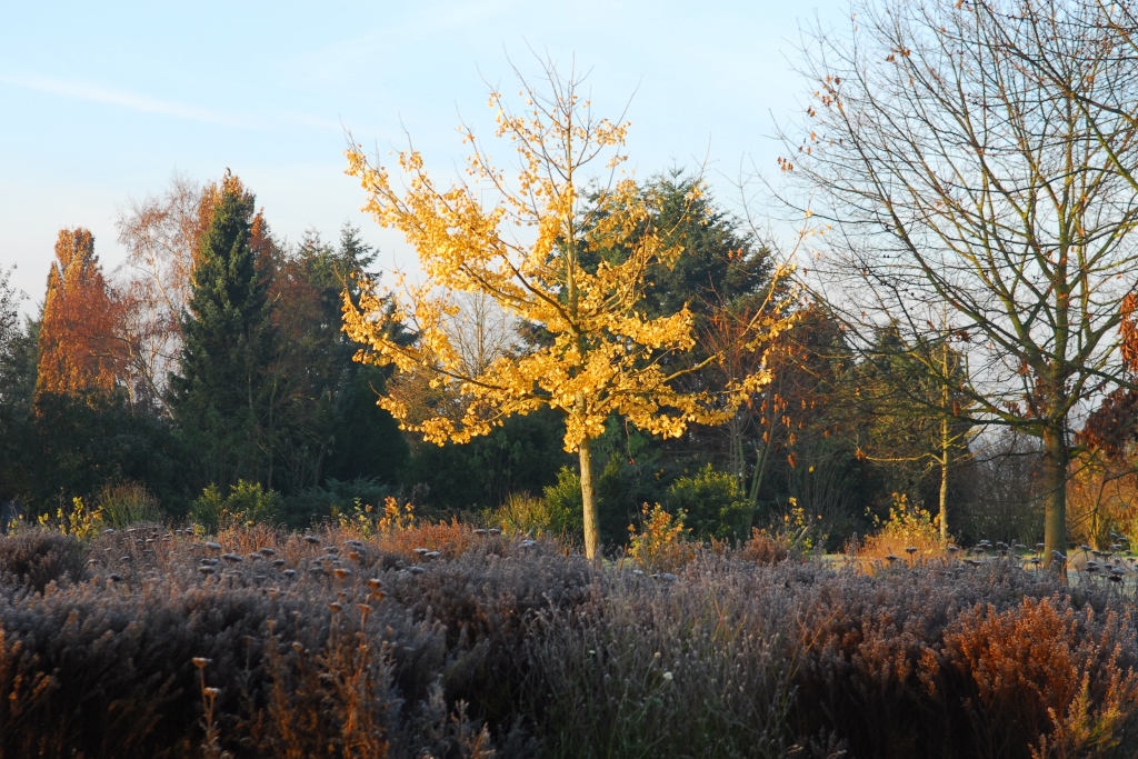 Wie aus puren Gold leuchten die Blätter des Gingko zwischen grünen Nadelbäumen, den Skeletten der schon kahlen Bäume und den kupferfarbenen Buchen. Die Landschaft wird klar, ihre Struktur deutlich erkennbar, Verborgenes sichtbar. Magischer Nebel verhüllt es manchmal, an einigen Tagen wird es kaum hell, dann ist der Himmel wieder satt blau. Eine letzte Rose blüht, die Sterne der Sonnenhüte strahlen im Morgentau, ebenso eine einsame Storchenschnabelblüte, der ganze Garten hat einen warmen, kupfergoldenen Grundton.