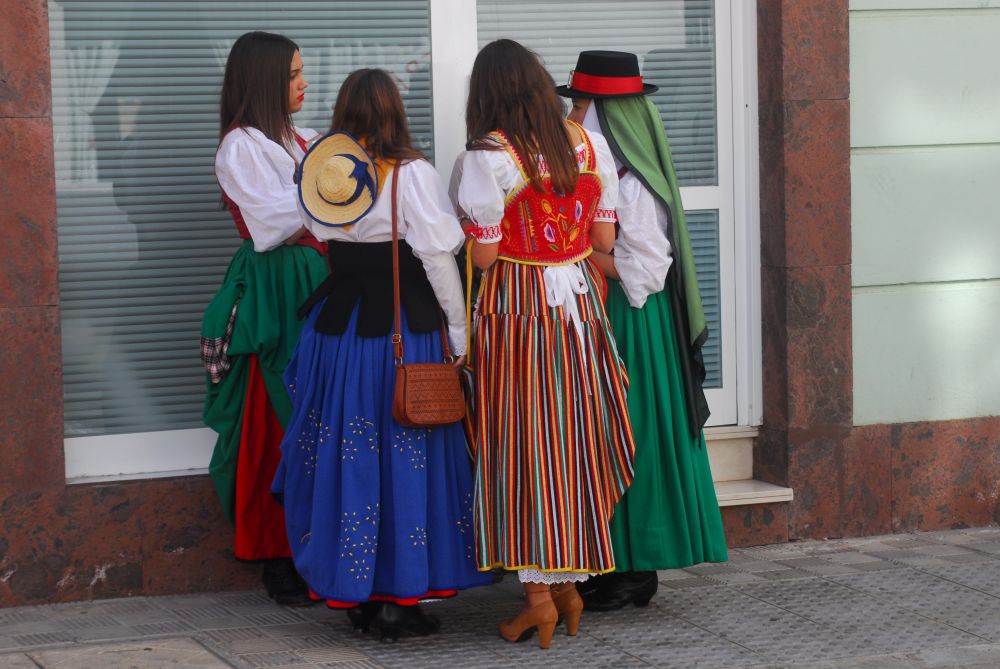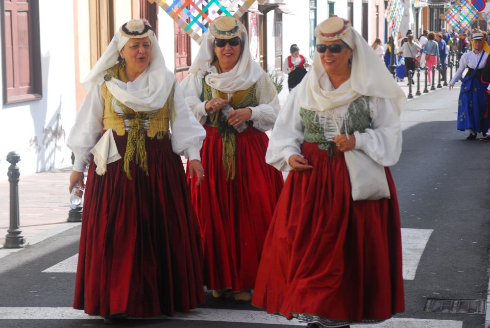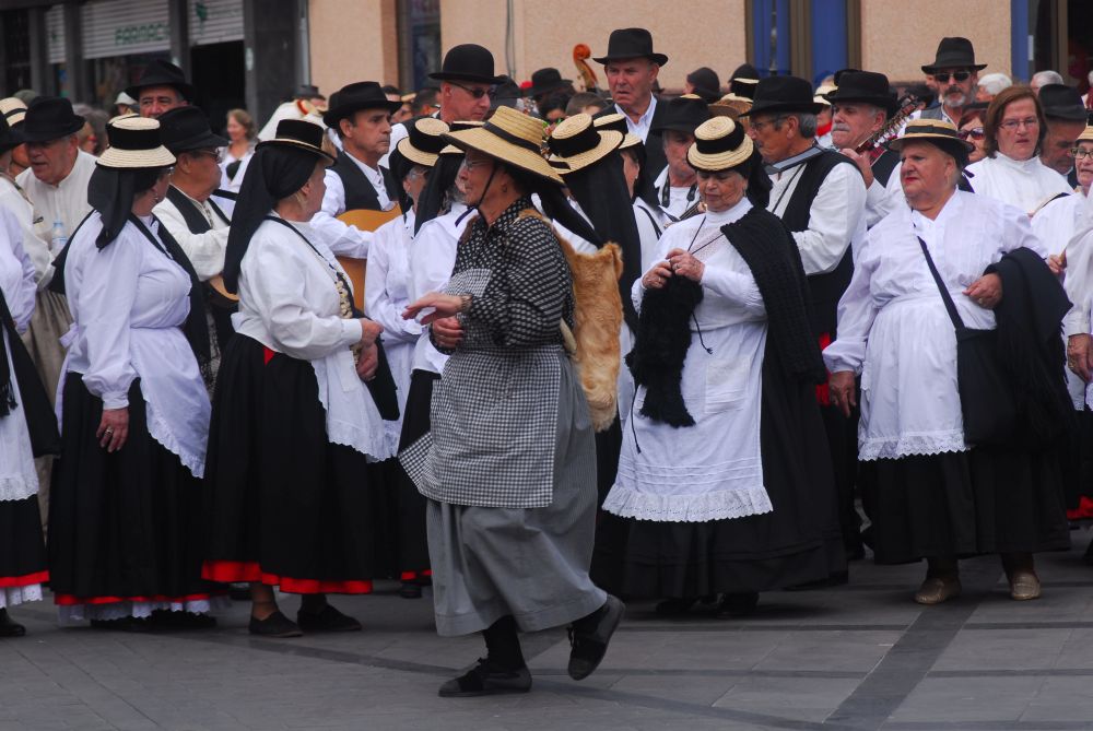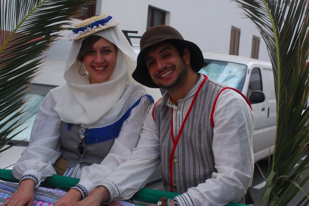 Die Parade beginnt am oberen Ende der Hauptstraße. Dem Fahrzeug der Polizei folgen tanzend und singend etwa 10 Folkloregruppen, allen voran die Romera Mayor mit ihren Hofdamen. Was es genau damit auf sich hat, hab ich nicht herausgefunden: Die erste Gruppe tanzt zum Rhythmus von riesigen Kastagnetten, es folgen Sängerinnen und Gitarren Spieler, urige Typen, schöne Frauen und süße Kinder. Vor der Kirche bringt jede Gruppe dem geschmückten Patron im knappen Lendenschurz ein Ständchen dar.