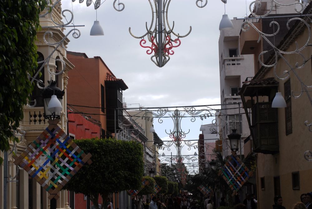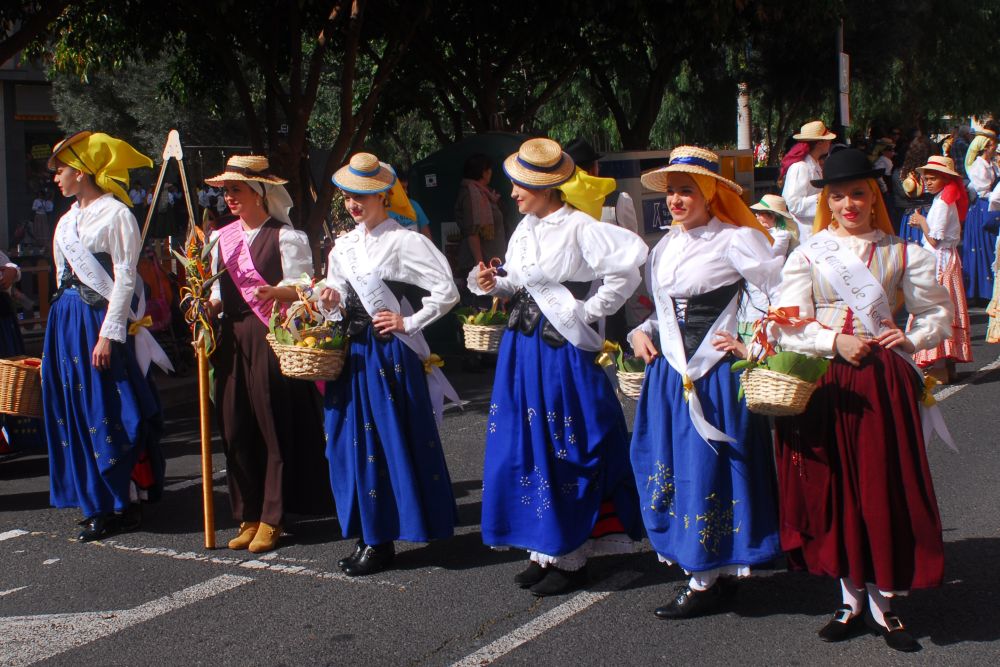 Danach ziehen sie weiter, gestärkt mit gekochten Kartoffeln, beträufeld mit roter Mojo, Soße, Schafskäse und etwas, das wie Mandelgebäck ausieht. Mitgeschleppt wird das alles im Baggagewägelchen, wie in Kölle im Karneval sind das verzierte Kinder- oder Leiterwagen.