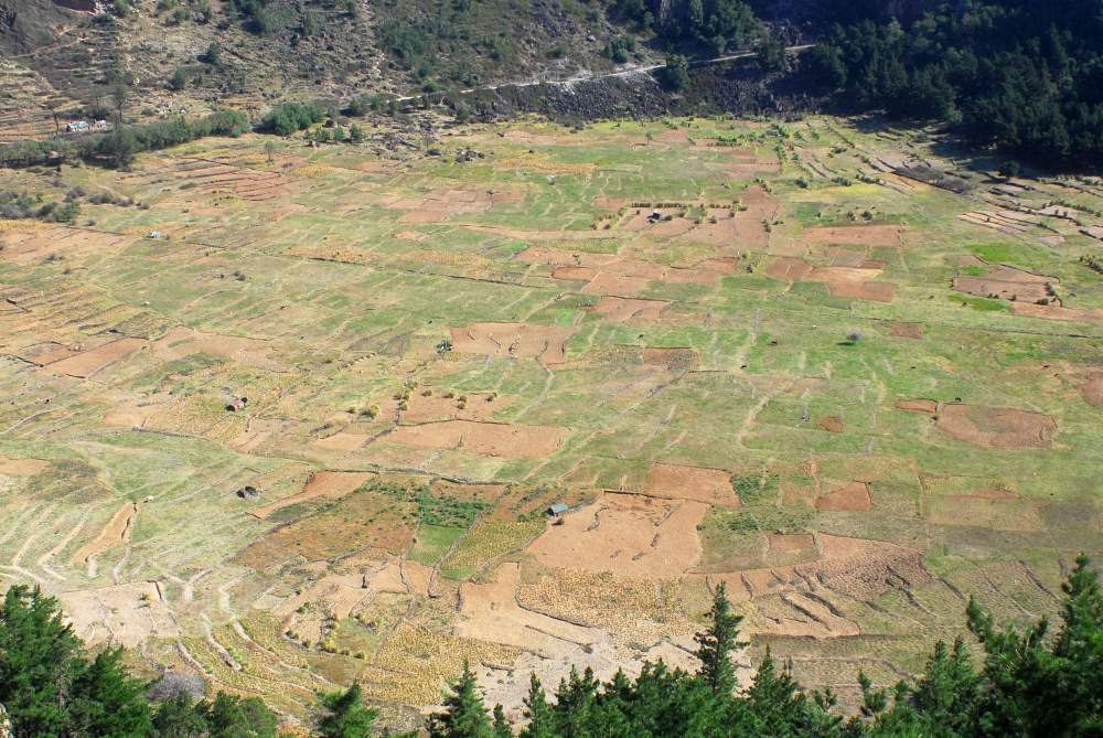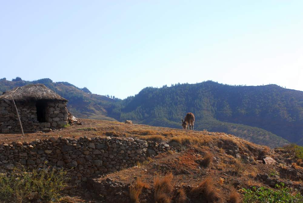 Ein gepflasterter, gut befestigter Weg, gerade breit genug damit zwei schmale Autos aneinander vorbei können, windet sich hinauf in die kahlen, rotbraunen Berge. Grau verstaubte, niedrige Akazien drücken sich an den Wegesrand, darunter blühen gelbe Aloen. Wild zerfurcht sind die Schluchten. Je höher wir kommen, umso grüner und dichter werden die Akazien, bald gehen sie über in einen Eukalyptuswald. Erst dort oben stehen vereinzelt Häuser, die sich manchmal zu lockeren Ansammlungen gruppieren. Manche sind bunt angemalt, die meisten aber zementgrau und halbfertig. Bunt ist nur die Wäsche auf der Leine. Ziegen und Hühner laufen herum, auf mancher Weide stehen zwei Kühe. Esel warten angepflockt am Straßenrand auf ihren Einsatz.