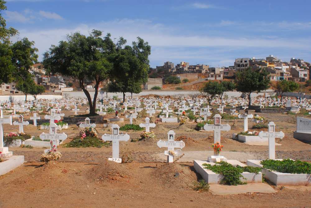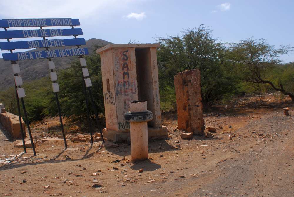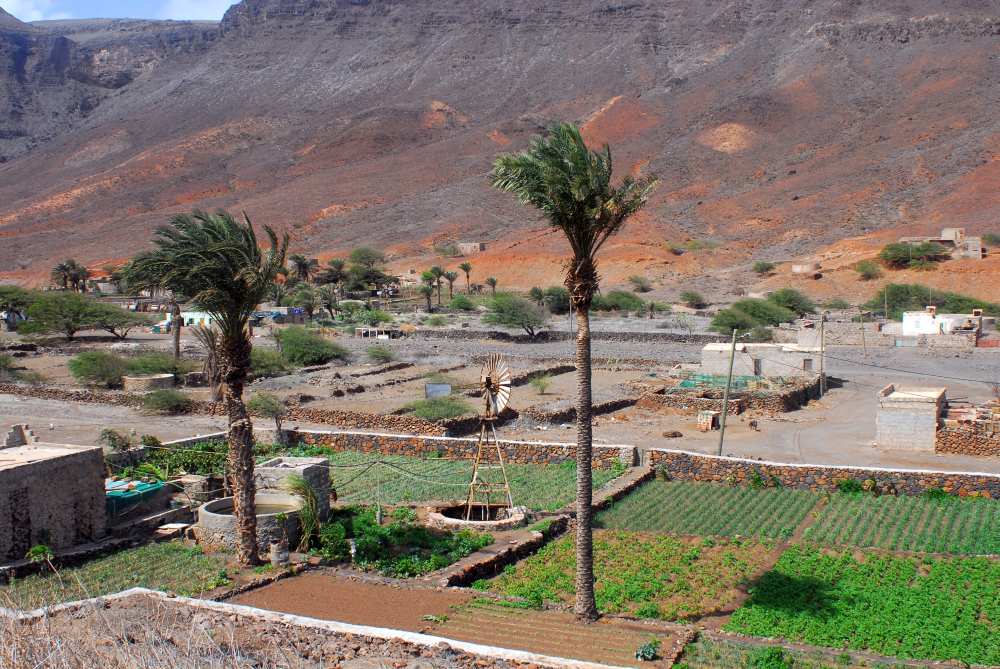 Erst geht es hinauf auf dem Monte Gordo, von dem aus wir den Blick über die Bucht von Mindelo und Baia das Gatas schweifen lassen. Dort haben die Wohlhabenden ihre Ferien- und Wochenendhäuser. Man kann dort ruhig und sicher vor den Wellen baden. An der Ostseite der Insel liegt ein fruchtbares Tal in einem trockenen Flussbett: Der Tau, der sich oben am Berg aus den Wolken absetzt, rieselt langsam in die Tiefe, trifft auf Wasserundurchlässige Schichten. Windmühlen pumpen es aus den Brunnen in hochmoderne Tröpfchenbewässerung. Die war uns schon auf Santo Antao aufgefallen. Thomas, der neue Trans-Ocean Stützpunkleiter auf Mindelo, hat sie auf den Kap Verden eingeführt, er berät mittlerweile die Regierung in Sachen Bewässerung.