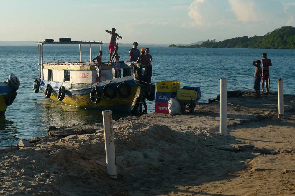 Gegenüber von unserem Ankerplatz wird ein Saveiro entladen. Mit diesen alten, breiten Kähnen werden immer noch Lasten in der Bucht transportiert: Mit ihren riesigen Segeln an einem natürlich gewachsenen Stamm sind sie unglaublich schnell, durch ihren geringen Tiefgang kommen sie auch über die Sandbänke.