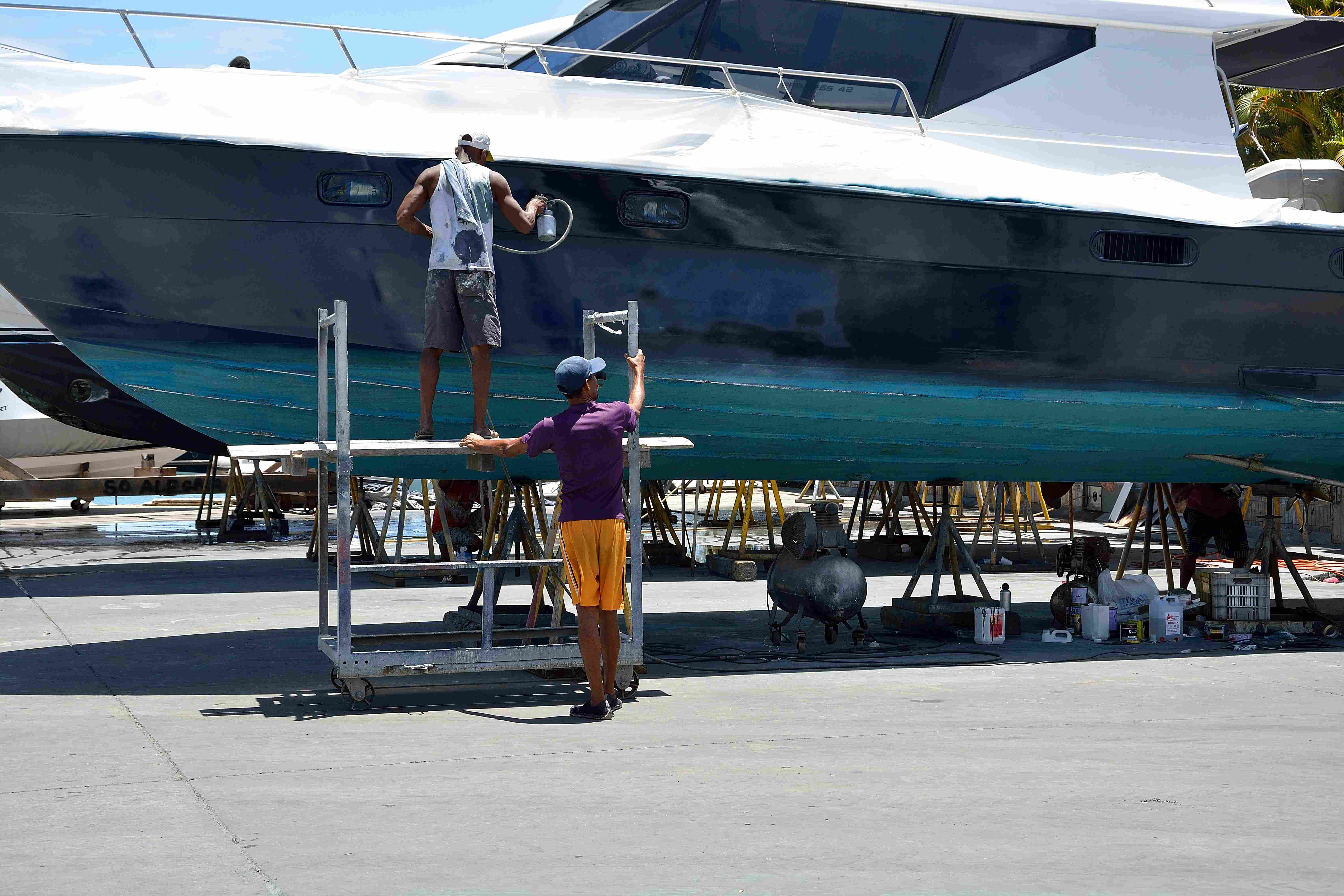 Nachdem Tomy die Schraube geschliffen, poliert und geschmiert hatte, legten Carlos Leute am frühen Nachmittag los, befreiten Yemanja von jeglichen Muschelresten und schliffen das Unterwasserschiff.