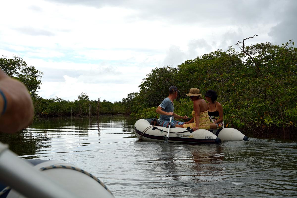 Die Crew der SIMARIL, Blanca und wir verlassen den Ankerplatz vor Blancas Heim gegen acht Uhr morgens, um zwischen der kleinsten Ilha dos Ratos und den Mangroven zu ankern. Dort steigen wir ins Dinghi um und rudern in den kleinen Seitenarm des Maraú. Davon gehen wieder zwei Seitenarme ab, wobei der erste kaum zu erkennen ist. Ohne Blanca hätten wir den zweiten als ersten gezählt und somit die Einfahrt lange gesucht. Wir binden die Dinghis bei den Überresten eines alten Piers fest und stapfen durch das Wasser über die Wurzeln der Mangroven durch den Sumpf an Land. Von dort führen Fußstapfen durch die Mangroven und drei Sandfelder zu bewirtschafteten Land. Zwei Familien leben dort, unter einfachsten, aber nicht unbedingt armen Bedingungen: Es reicht für ein Auto und hübsche Kleidung fürs Baby.