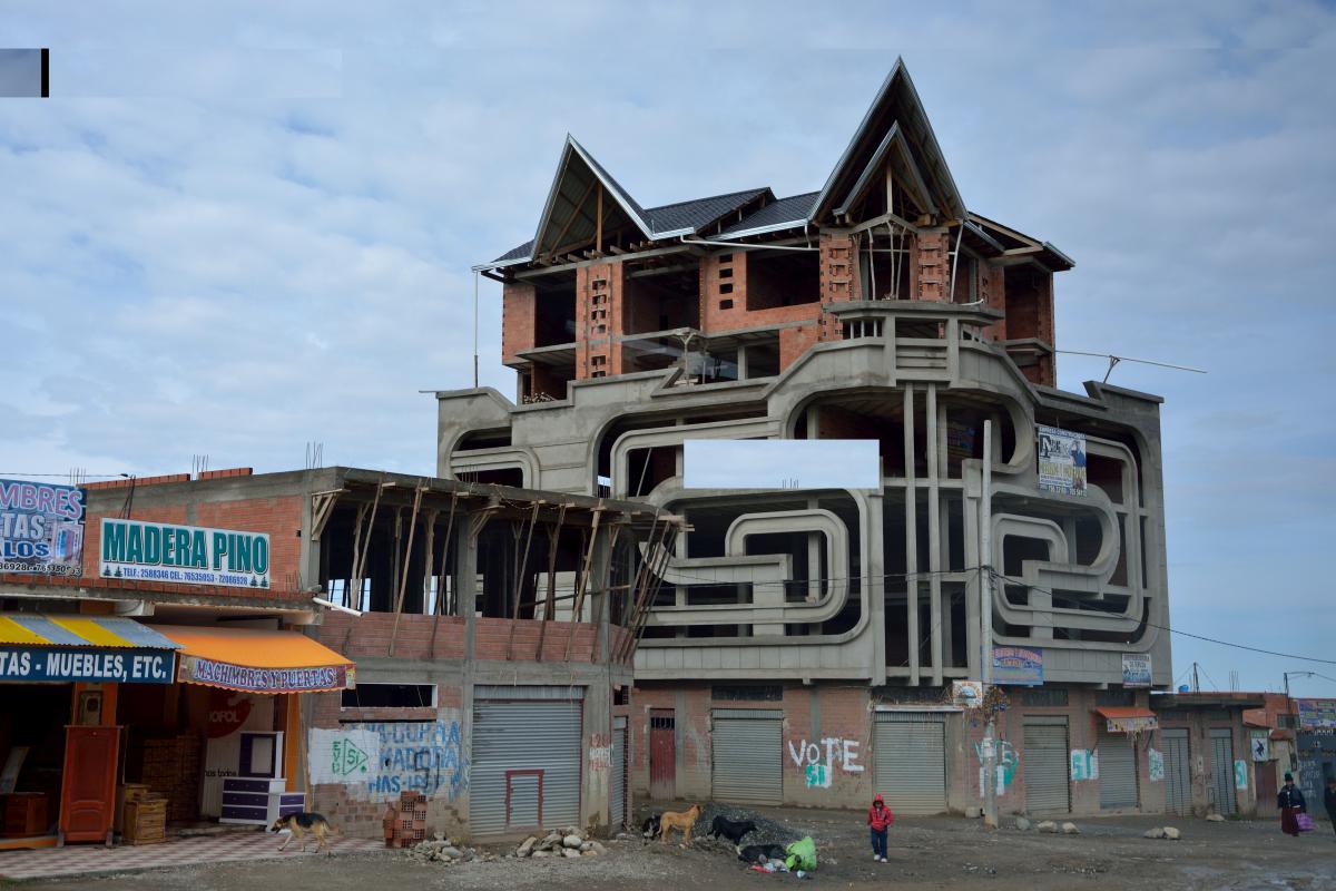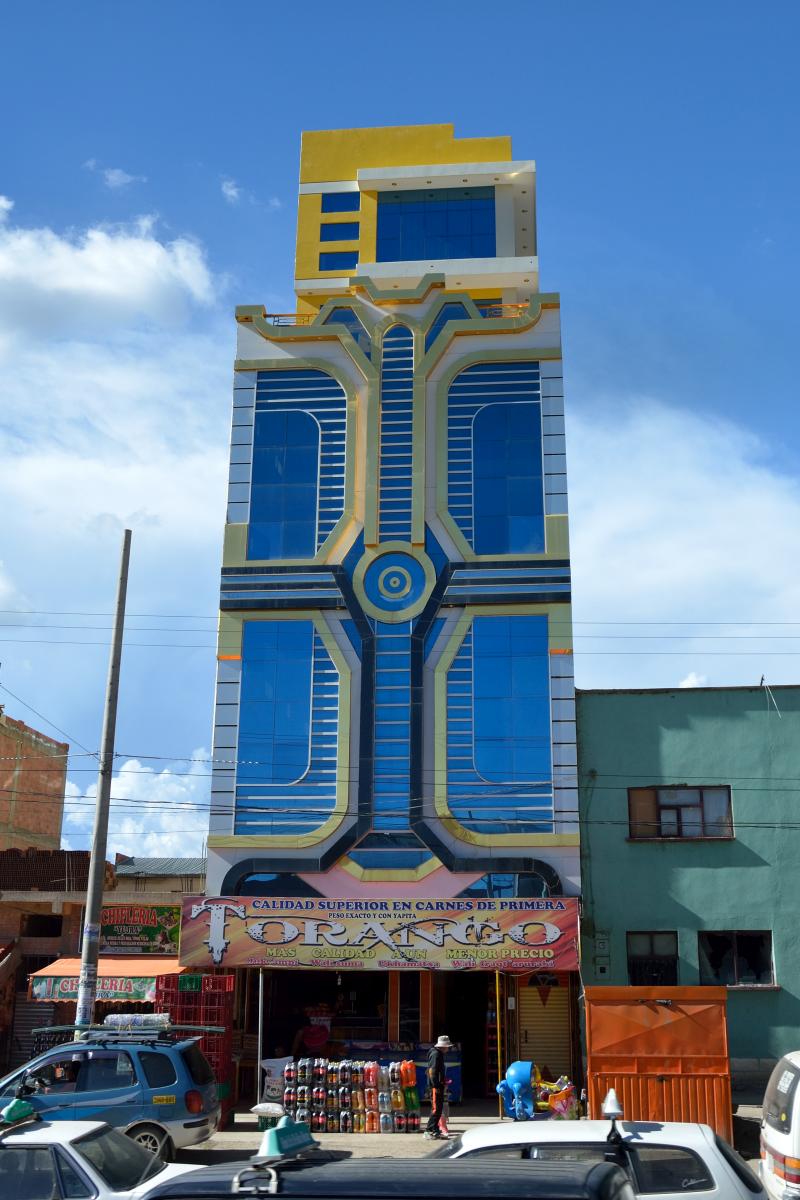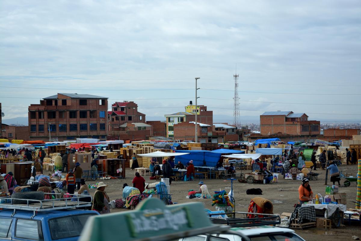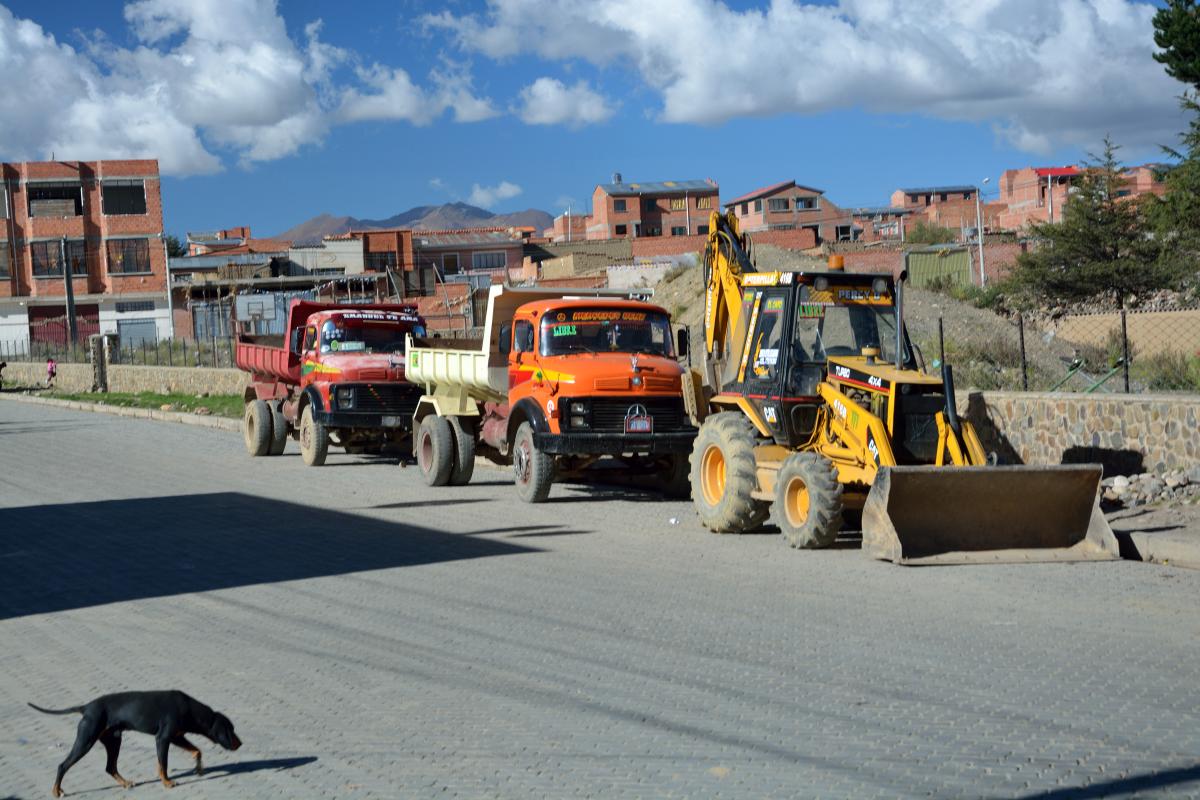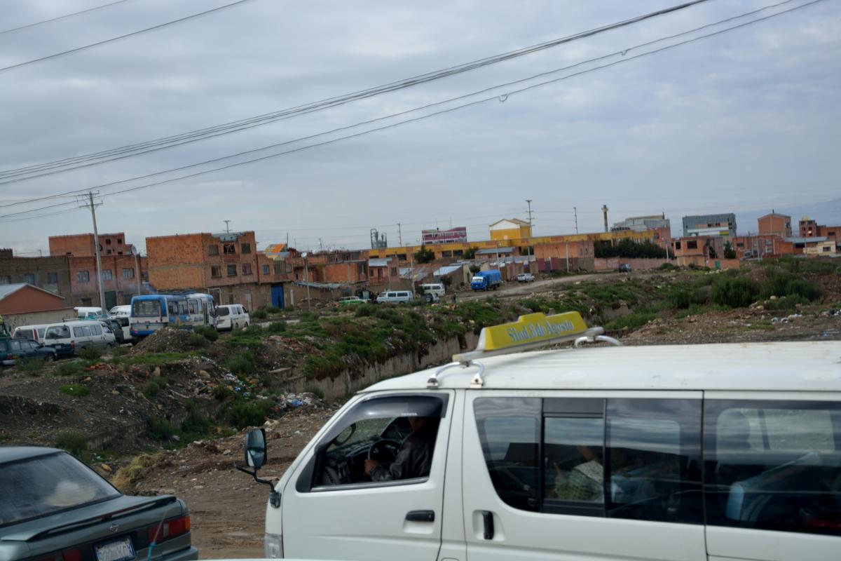 Die Fahrtzeit sollte abhängig vom Verkehr sein. Dieser trifft uns wie ein Schlag! So viele Microbusse hatten wir nicht erwartet! Die Fahrt führt erst hinauf nach El Alto, und dann wieder durch allerlei ungepflasterte Nebenstraßen und Baustellen, vorbei am Möbelmarkt, durch die Straße der Baustoffhändler hinaus ins Altiplano. Immer wieder stehen am Straßenrand Baufahrzeuge, deren Besitzer offensichtlich auf einen Auftrag warten. Dabei ist ganz El Alto eine Baustelle: Verputzt sind nur die Kirchen, alles andere sieht nach Rohbau aus. Die fertigen Häuser sehen meist auch schon abbruchreif aus oder wie Spielhöllen. Dieser moderne Inka-Stil ist nichts für mich. Aber gut, den Leuten hier gefällt es!