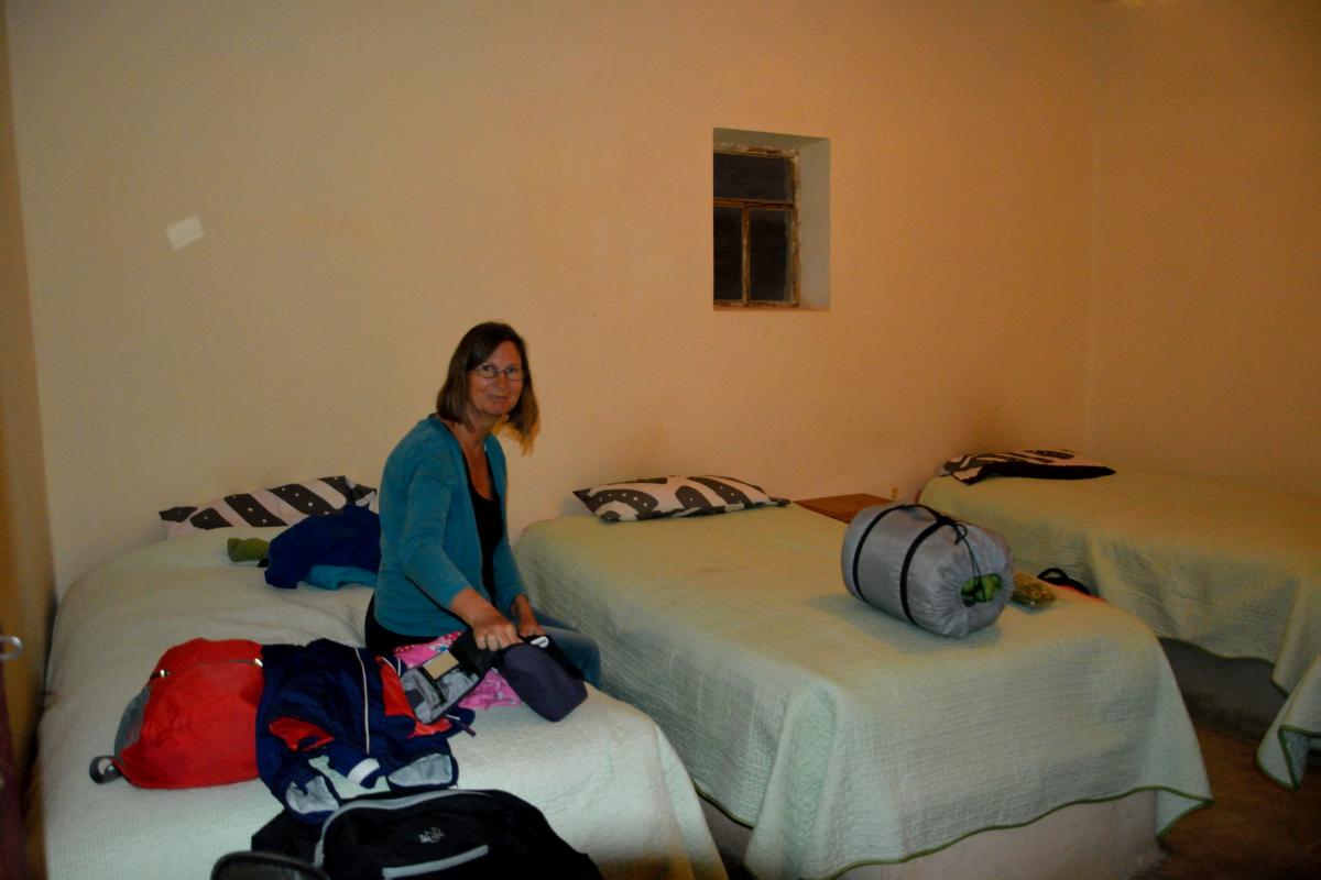 Und überholt alle. Das hat den Vorteil, dass wir als erstes an der Unterkunft sind und uns unser Zimmer, das wir mit unseren Mitreisenden Ben und Toni teilen, aussuchen können. Nicht dass es da viel Wahl gäbe: In jedem Raum stehen vier bis fünf Betonsockel, auf denen eine Matratze und eine dicke Decke samt Kopfkissen liegen. Sonst ist nichts in dem schmucklosen Raum. Das Fenster führt in den ebenso spartanischen Essraum, es gibt zwei Toiletten – Klopapier ist selbst mitzubringen – und eine Dusche, die keiner benutzen mag. Es ist mehr als einfach, erfüllt aber seinen Zweck. Lidias Abendessen, heiße Suppe und Gemüsefleisch-Frikadellen, tut uns allen gut.