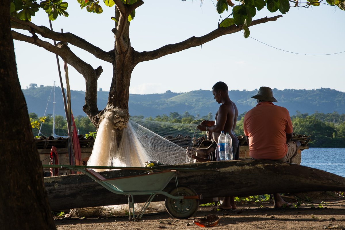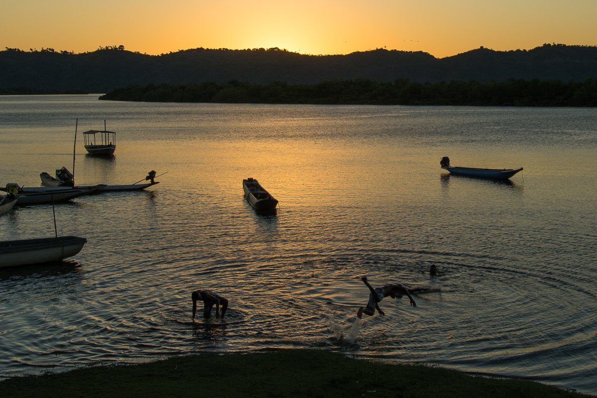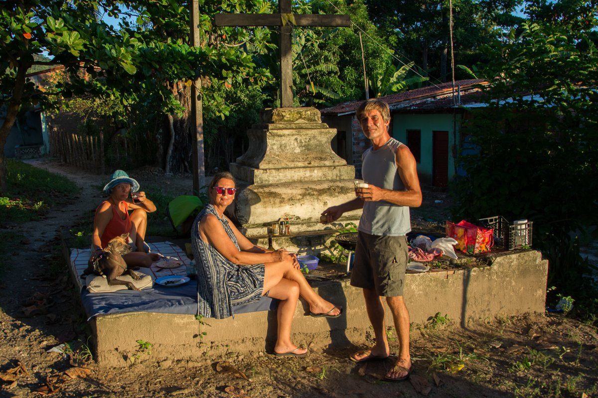Wir fahren weiter, diesmal durch nicht kartographierte Gewässer hinauf nach Sao Tiago de Iguape. Völlig ruhig liegen wir im Fluss vor diesem verschlafenen Fischerdorf. Wir warten auf die Flut, dann landen wir an, suchen uns ein schattiges Plätzchen neben einem Kreuz um zu grillen. Der Absperrhahn des Gasgrills klemmt, erst mit Hilfe der freundlichen Fischer und deren Werkzeug gelingt es Marcel und Tomy das Teil in Gang zu setzen. Bald geht die Sonne unter, die Jugendlichen des Dorfes toben im Wasser, Sao Tiago und Maria winken uns zum Abschied – schade, hier würde ich es noch eine Weile aushalten.