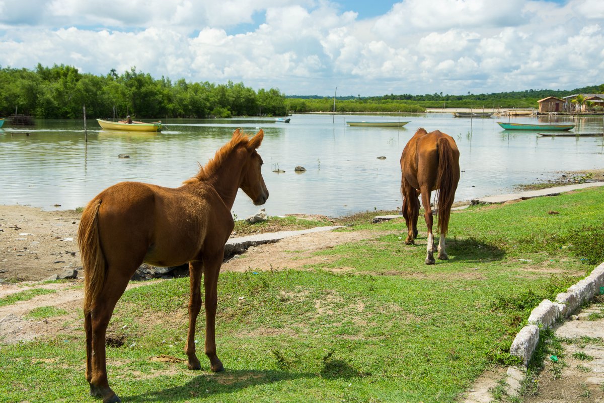Gemeinsam mit Joanna von der Chulugi und Jochen, den wir schon in Monnickendam kennen gelernt hatten, suchen wir die Baumkirche oder den Kirchenbaum auf Itaparica, finden anfangs aber nur das charmante Fischerdorf Baiacu auf der Innenseite der Insel: Packesel ziehen an uns vorbei, streunende Pferde suchen am Ufer nach Gras und nach Liebe (oder auch nur Trieben), Fischer flicken ihre Netze und die Winkelkrabben suchen vor uns Schutz unter den Hütten der Fischer. Eine Bierbude oder Barraca gibt es auch: Der Tag ist schon mal gerettet.