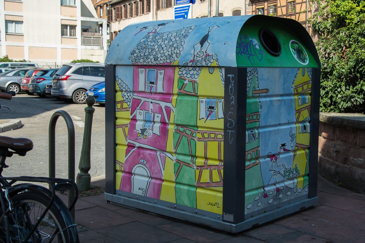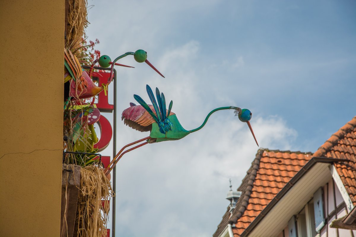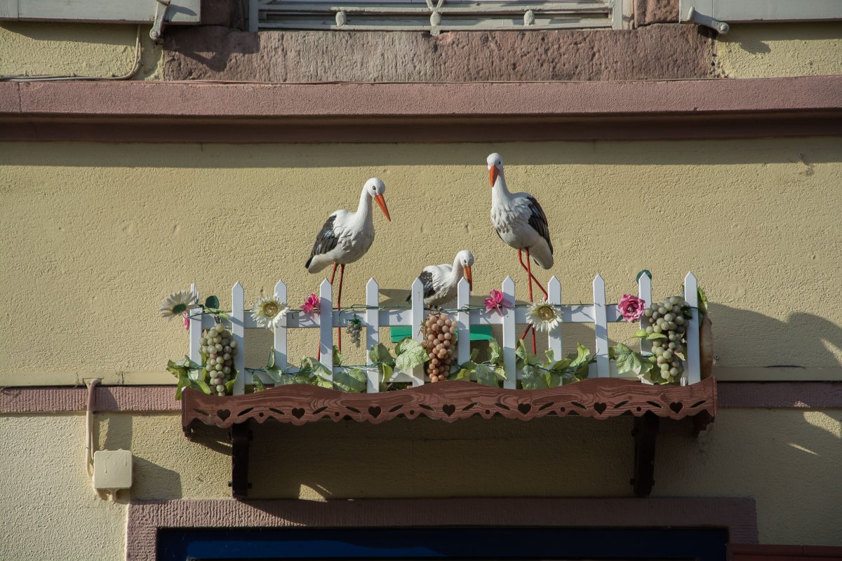 Schon in Straßburg fielen mir die Störche auf: Sie prangen auf Schildern, Glascontainern und in Auslagen, nur nicht in Echt. Also machte ich mich in Google auf die Suche nach den Störchen im Elsass: Dort gilt er als ein heiliger Vogel, der Glück bringt, ein Symbol für Wohlstand und das Elsass ist. Mitte der 70er Jahre des letzten Jahrhunderts galt er als ausgestorben, es gab gerade noch 9 Storchenpaare im Elsass. Programme zum Schutz und zur Auswilderung ließen die Population auf etwa 800 Paare ansteigen. In der Orangerie in Straßburg leben rund 100 Paare, viele davon bleiben auch im Winter. Der Rest macht sich Ende August auf den langen Weg nach Afrika. Vermutlich haben wir deshalb keine lebenden Störche mehr gesehen, sondern nur mehr verlassene oder unbenutzte Nester auf den Dächern rund um Hunawihr. Dort gibt es auch einen Strochenpark.
