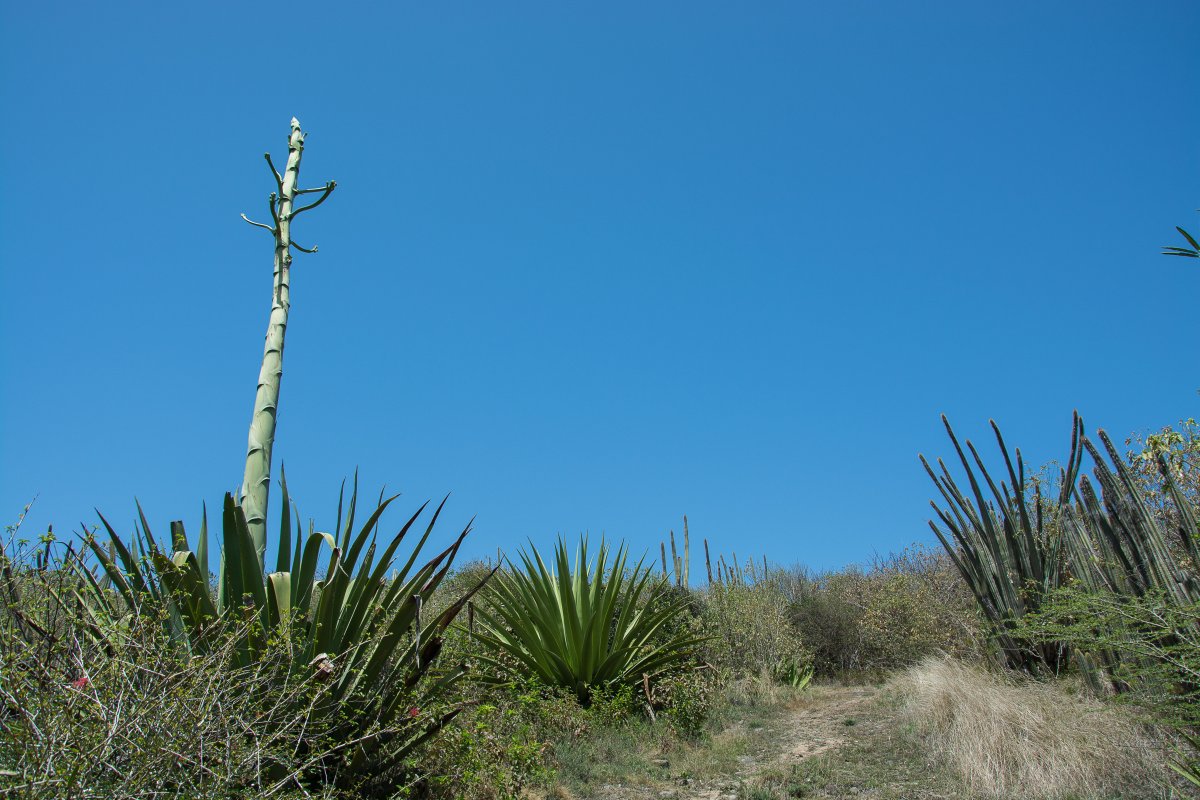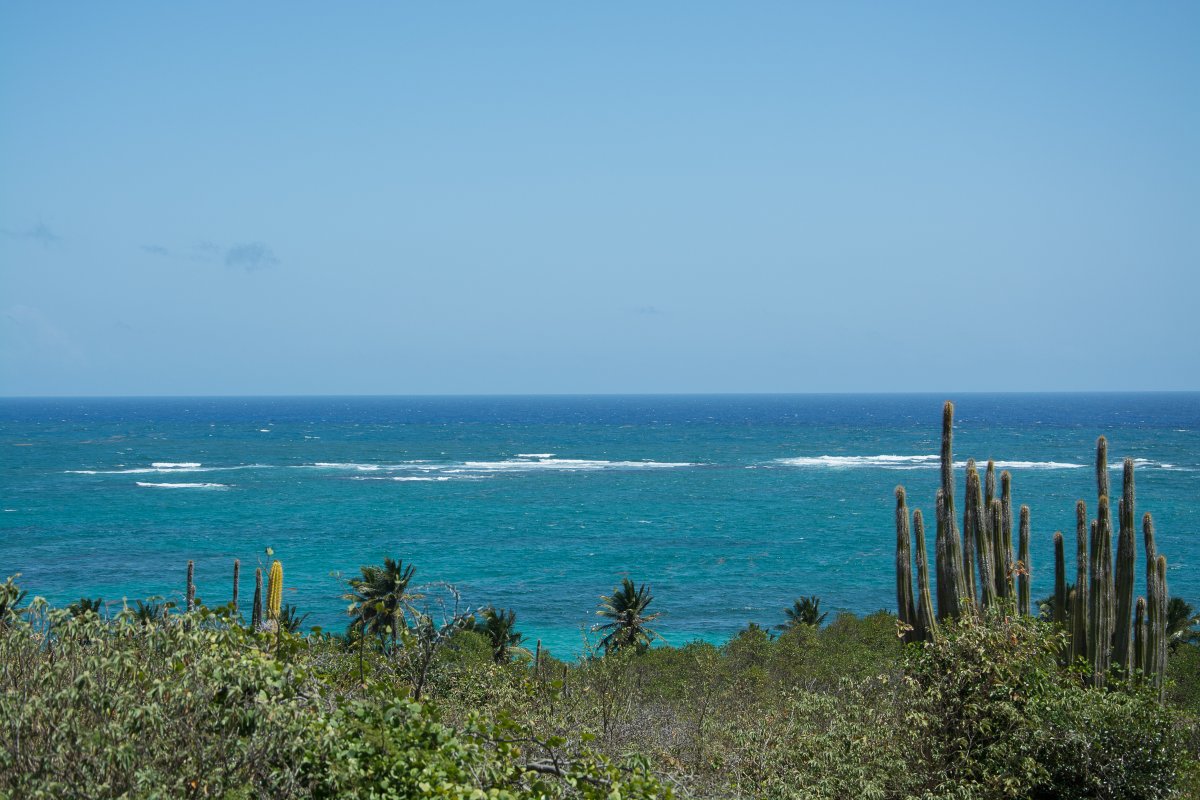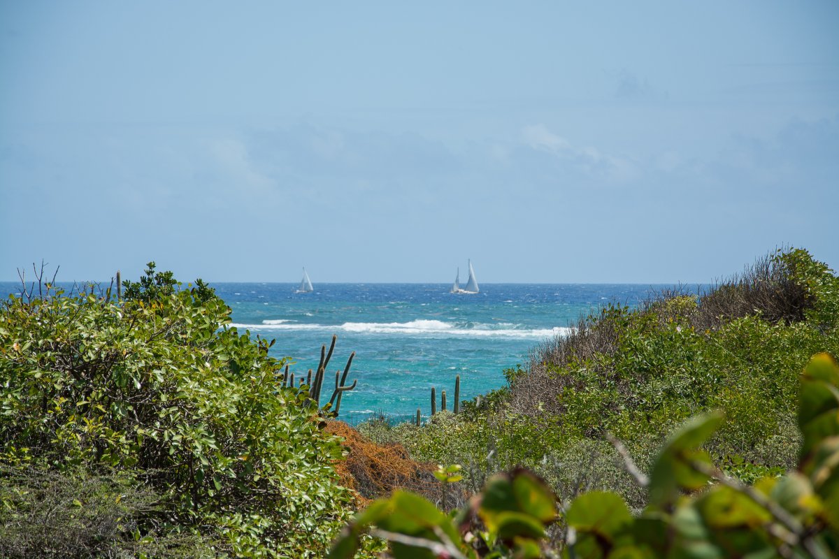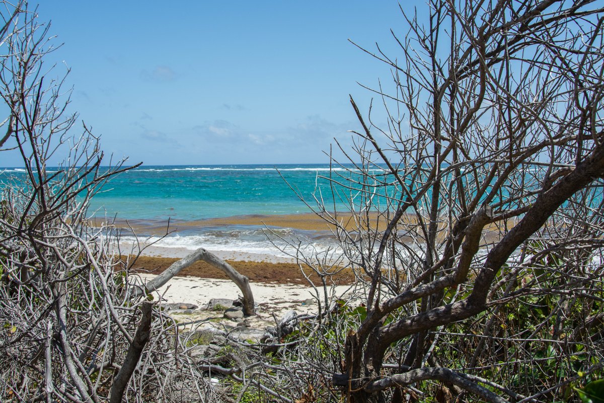 Wir fahren an der wilden Atlantikküste zurück. Wirklich schön wird sie erst im Süden, hinter Le Marin. Dorthin fahren wir am nächsten Tag mit Ernst und Anna-Maria von der GALATEA zum Wandern. Erst wollten wir an die Salinasbucht anschließen, doch dort waren die beiden schon, also suche ich einfach eine Stelle mit vielen Aussichtspunkten und finde Grande Macabou. Vom Parkplatz geht es nach rechts durch eine Macchia-ähnliche Landschaft voller Agaven, Kakteen und dornigen Gestrüpp. Später führt der Weg durch Mangroven und am Strand entlang zurück zu einer kleinen Kapelle in der Nähe des Parkplatzes. Immer wieder wird der Blick auf türkisfarbenes, wildes Meer frei. Hinter den Riffen segeln zwei Schiffe zwischen großen Flecken mit Saragossa-Algen: So schön die Küste hier ist, baden ist nicht! Wandern dafür umso mehr!