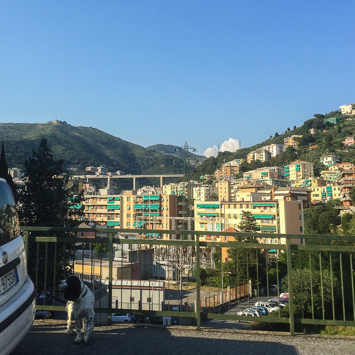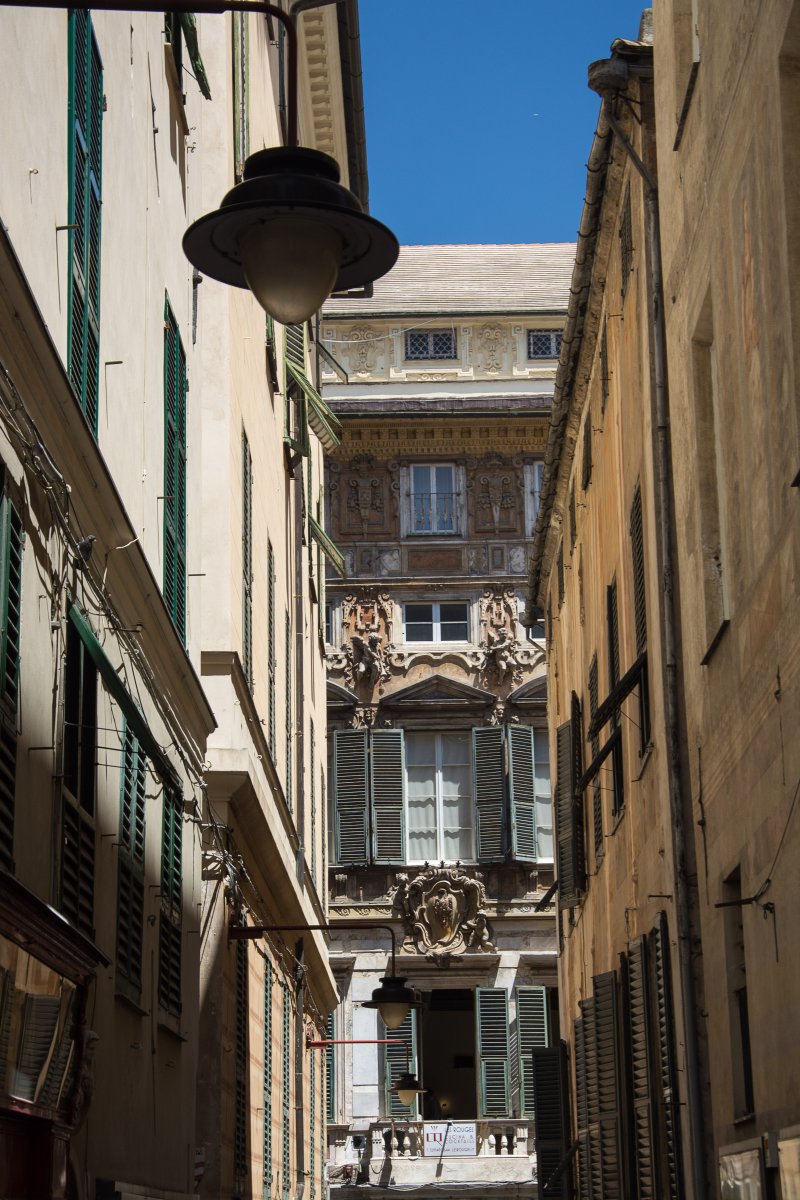 Garantiert nicht! Irgendwelche Drähte, Brücken, Bahnlinien, Straßen, Autos oder Geländer sind immer im Weg. Die Gassen sind zu eng, das gibt nichts. Manche Häuser kannst du überhaupt nur im Vorbeifahren fotografieren. Das wird mal mehr, mal weniger gut. Aber immerhin hat man da oft einen guten Überblick. Vom Auto aus sieht man eine Menge – Parken und Fotografieren geht allerdings mangels Platz nicht. Genua ist mehr als fotoscheu!