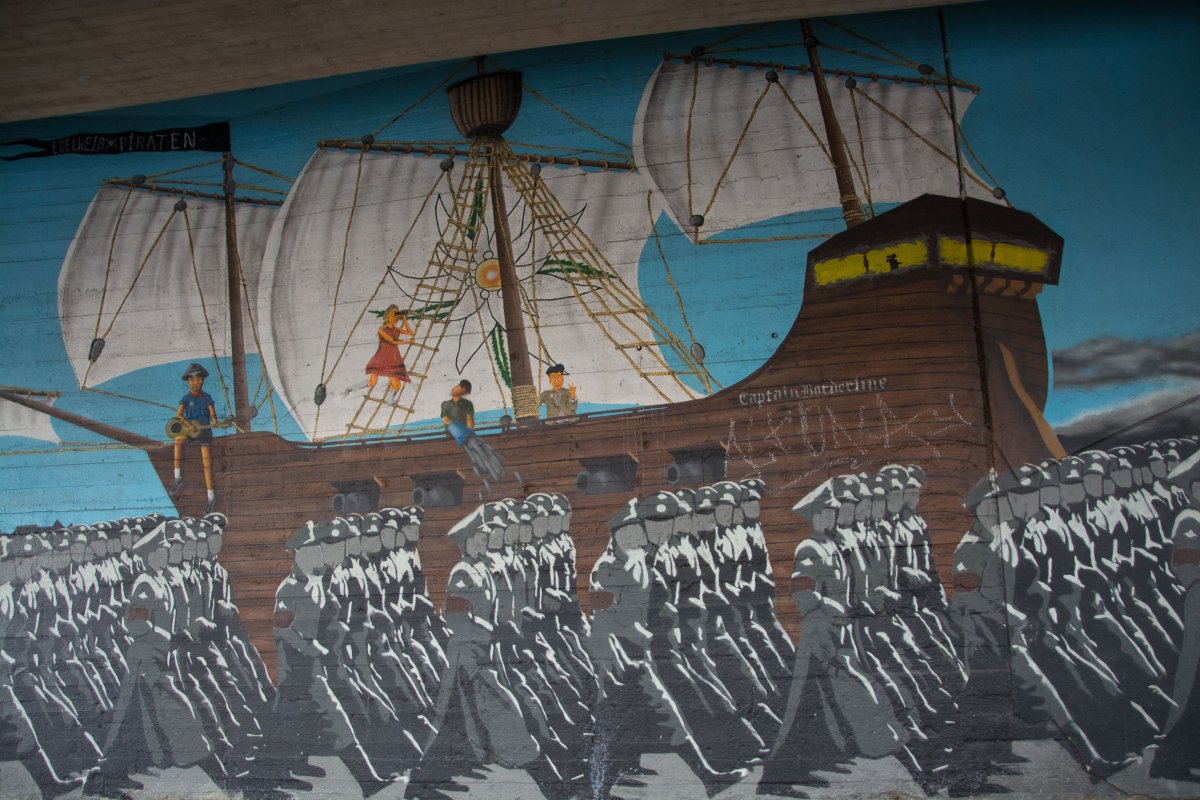 Murals des Düsseldorfer Künstlers L.E.T (Les Enfants Terribles). Seine Technik ist angelehnt an die Stencils der kubanischen Revolution. Er verfremdet oft bekannte Motive und stellt sie humorvoll in einem neuen Zusammenhang. Er ist weltweit bekannt. Mehr von seinen Werken findest du hier. Mit Trotzkind will er den Schwächsten der Gesellschaft eine Stimme geben.