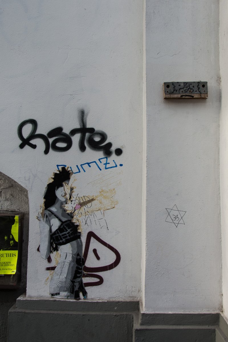 Das ist beim Graffiti eher nicht der Fall: Bei den Tags, den Writings, also den mehr oder weniger bunten Schriftzügen, die zum Beispiel entlang der Bahnstrecke an den Schallschutzwänden prangen, handelt es sich normalerweise um illegal angebrachte Farbe, zum Abgrenzen des Territoriums oder um sich selbst in der Szene einen Namen zu machen. Verstanden werden sie nur in der Szene. Street Art ist dagegen für alle da.