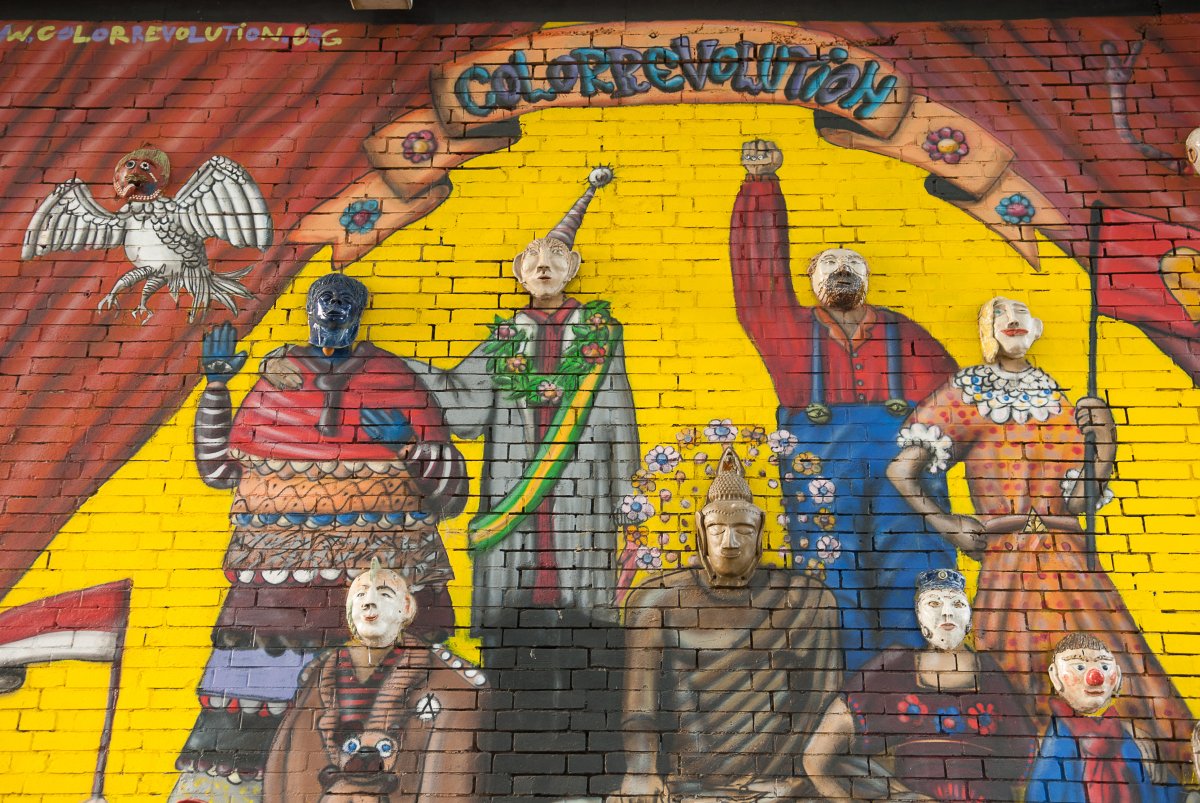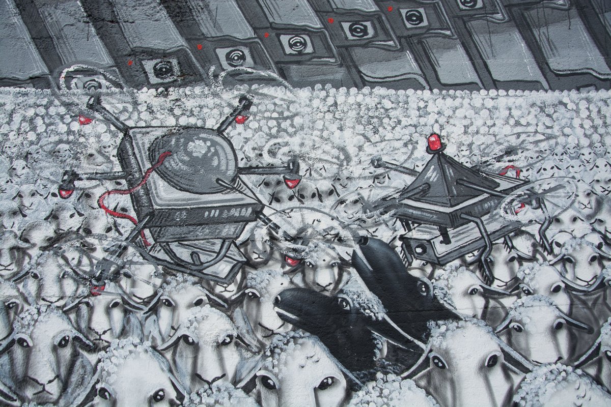 Dieses schon oben angesprochene Mural ist riesig! Es besteht aus drei Teilen: Links und rechts wird Energiegewinnung gezeigt, die die Natur zerstört und die Energie für die Überwachung erzeugt.