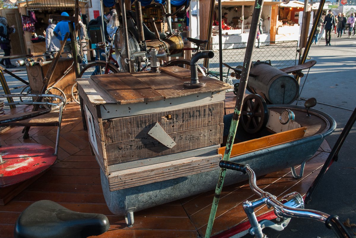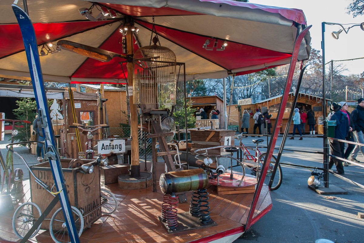 Kunsthandwerkermarkt nennt sich der Weihnachtsmarkt am Karlsplatz: Es gibt dort tatsächlich ein schönes handwerkliches Angebot. Während auf allen anderen Märkten langweilige Massenware-Mützen angeboten werden, gibt es dort mindestens einen Stand mit handgefilzten Hüten und Schals, außerdem handgefertigte Kerzen, Blaudruck und vieles mehr. Das kulinarische Angebot ist biologisch, der Glühwein schmeckt! Das faszinierenste ist allerdings das Recycling-Karussell: Da fährt eine Badewanne mit, ein altes Fahrrad, ein Vogelkäfig, Stoßdämpfer… Bunt ist es nicht, aber sehenswert!