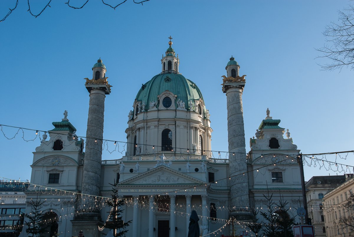 Habe ich anfangs gesagt, dass es mir in Wahrheit um die Stimmung und die Lichter geht? Da spielt Wien ganz vorne mit! Ich liebe die Weihnachtsbeleuchtung in meiner Geburtsstadt, auch die Stimmung, die vielen Maroni-Standln, die geschmückten Auslagen. Die zahllosen Weihnachtsmärkte sind mir allerdings zu viel. Wir stolpern bei unserer Herzeigetour über 11, manche gehen fast ineinander über: Schönbrunn, Opernpassage, Stephansplatz, Hoher Markt, Freiung, Michaelerplatz, Rathaus, Museen, Belvedere, Karlsplatz und Riesenrad. Am Spittelberg hat es uns vor ein paar Jahren ganz gut gefallen, weil er dort in den Gassen statt findet. Aber sonst? Ich verstehe ja, dass die Stadt den Touristenansturm auf möglichst viele Märkte verteilen will, aber es ist einfach zu viel! An den meisten gehen wir zügig vorbei, weil es nicht mehr auszuhalten ist. Nur am Karlsplatz schauen wir uns noch um.