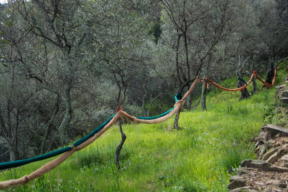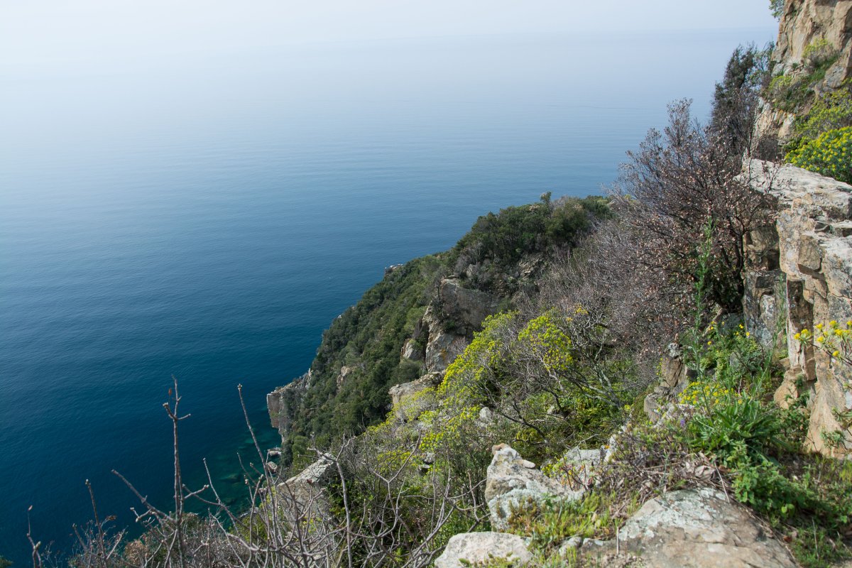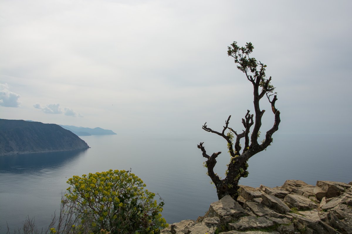Beim Haus Nummer 95 geht es wieder rechts durch Durchhaus, danach gleich links die Treppen hinauf zu einer schönen, etwa zweieinhalbstündigen Wanderung: Über schier endlose Treppen geht es an Olivenhainen und an Wiesen voller Allium, Löwenzahn, Gänseblümchen, allerleie Blatterbsen und Klee hinauf auf den Berg. Immer wieder gibt es einen schönen Blick hinunter in die Bucht. Bald geht die Vegetation über in einen Pinienwald und schließlich in Macchia. Oben am Berg hast du einen schönen Blick auf die noch weit entfernte Cinque Terre. Du könntest jetzt hinunter ins wenig attraktive Riva Trigoso gehen und mit dem Zug zurückfahren, oder einfach den gleichen abwechslungsreichen Weg nach Hause nehmen. Oder über die Madonna della Neve sozusagen innenherum gehen.