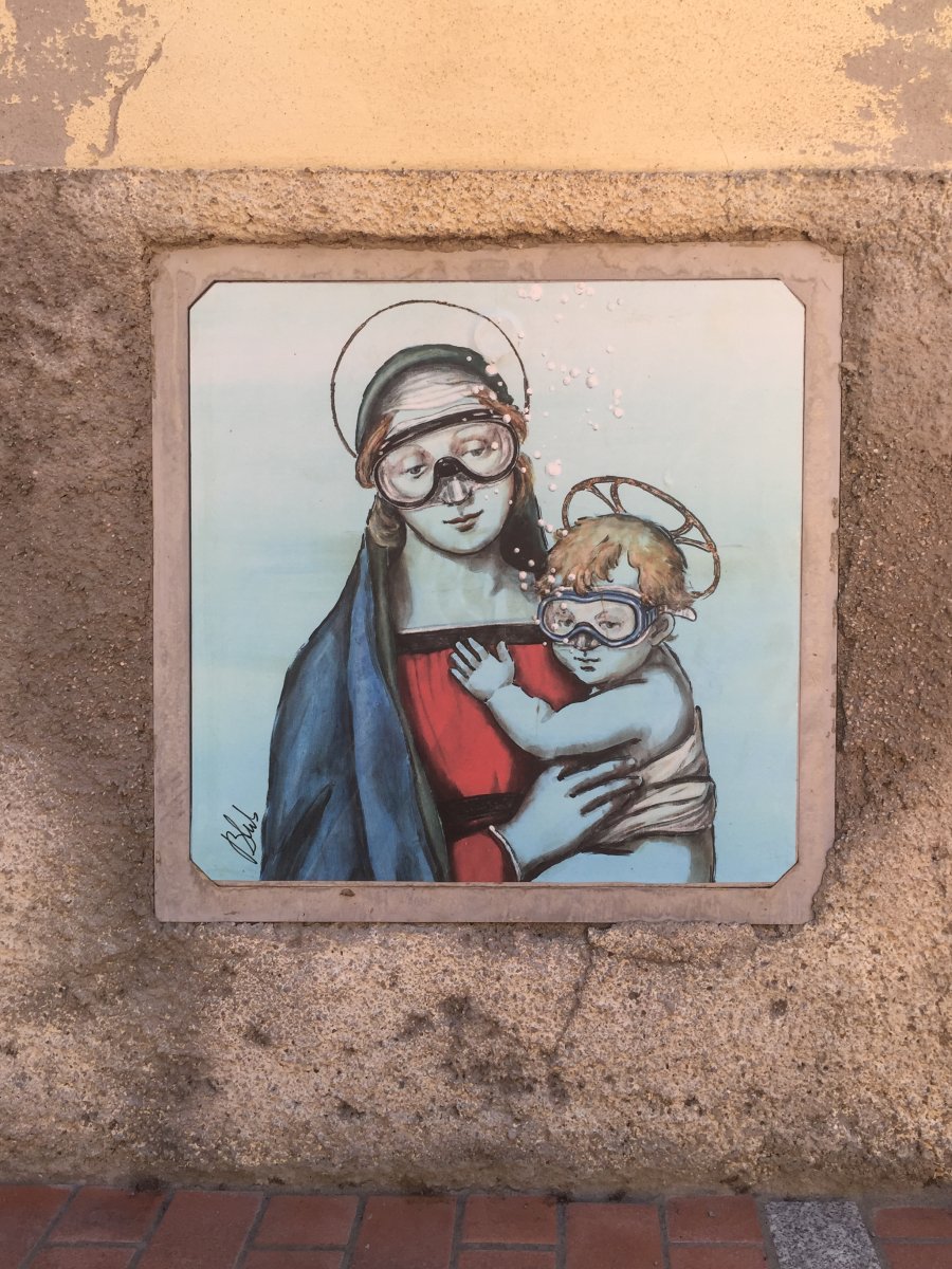 Campo nell‘Elba empfängt uns mit vielen Blumen und jeder Menge kleiner Straßenkunstwerke. Der Ort ist zwar touristisch geprägt, aber Restaurants und höherwertige Klamotten- und Souvenirläden überwiegen. Der Ort gefällt uns! Mir hat es der Künstler Blub angetan, der bekannte Kunstwerke und Figuren mit Taucherbrillen versieht. Später entdecken wir sein Werk auch in Lerici und Marciana Marina, doch nirgendwo in dieser Dichte.