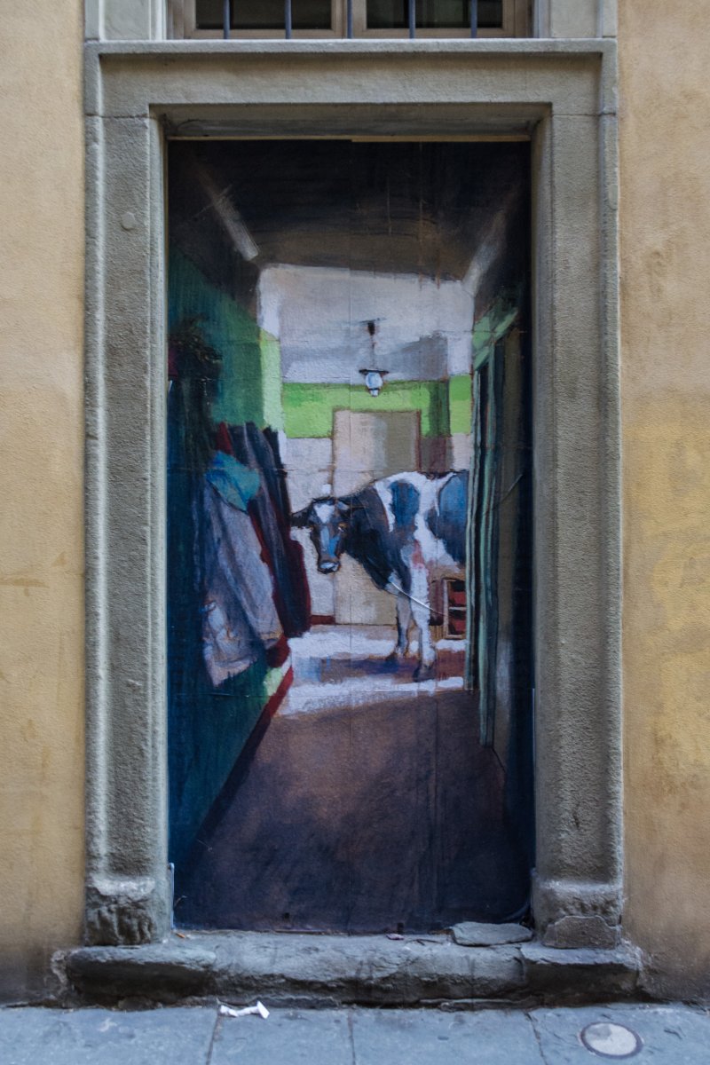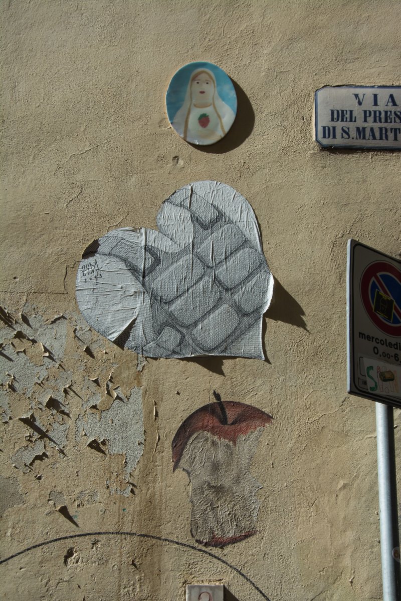 Mich zieht es unwiderstehlich in den kleinen Laden daneben: Dort verkauft Clet Abraham, Franzose, in Florenz lebend und arbeitend, seine Werke, meist in Form von kleinen Stickern. Fortan bin ich infiziert! Tomy trottet die restlichen Stunden in Florenz brav neben mir her und hilft mir, moderne Kunst zu suchen.
