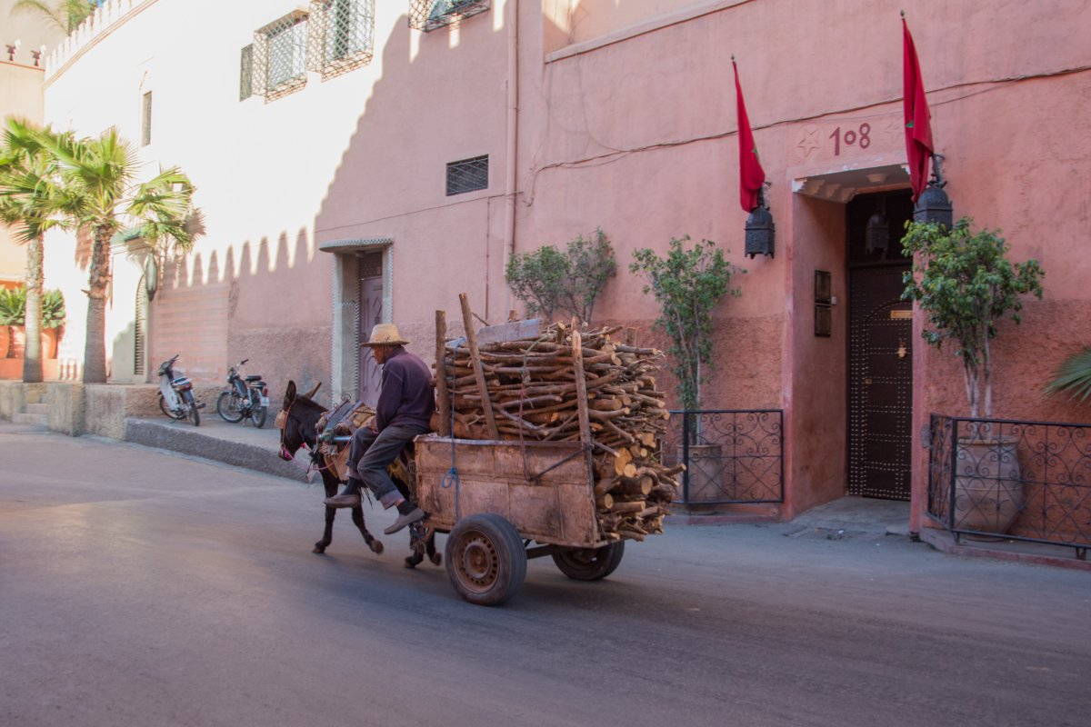 Natürlich hat Marrakesch orientalisches Flair – wenn du kein anderes kennst! Die Häuser sind erdfarben gestrichen, höchstens mit weißen orientalischen Mustern verziert, das ist hübsch und sehr harmonisch fürs Auge. In den Gassen der Medina herrscht reges Gedränge: Autos (wenige), Mopeds (viele), Fahrradfahrer, Handkarren, Eselskarren und Fußgänger schlängeln sich mehr oder weniger schimpfend und geduldig aneinander vorbei. Verkauft wird eigentlich überall etwas: Von Handkarren, von der Erde, in den Geschäften. Vieles mutet exotisch an, ist unseren westlichen Augen fremd: Die halbe Kuh hängt neben dem Stand mit den Lederhandtaschen, gegenüber werden marokkanische Lampen und Teegläschen verkauft. Es gibt Datteln und süßes Gebäck. Eine alte Frau bettelt, eine andere verkauft altes Besteck aus Blech. Es gibt Schmuck und Schühchen, Kaftane, Tücher und etwas, was wir als Morgenmäntel bezeichnen würden, bei den marokkanischen Damen allerdings Straßenkleidung ist. Nur ein paar ältere Männer tragen noch Beduinenmäntel mit Kapuzen. Die jungen Männer sind westlich gekleidet, aber Kapuzen finden auch sie praktisch gegen die morgendliche Kälte. Ich bin sicher, der Trend zu Hoodies bei den Migranten kommt daher.
