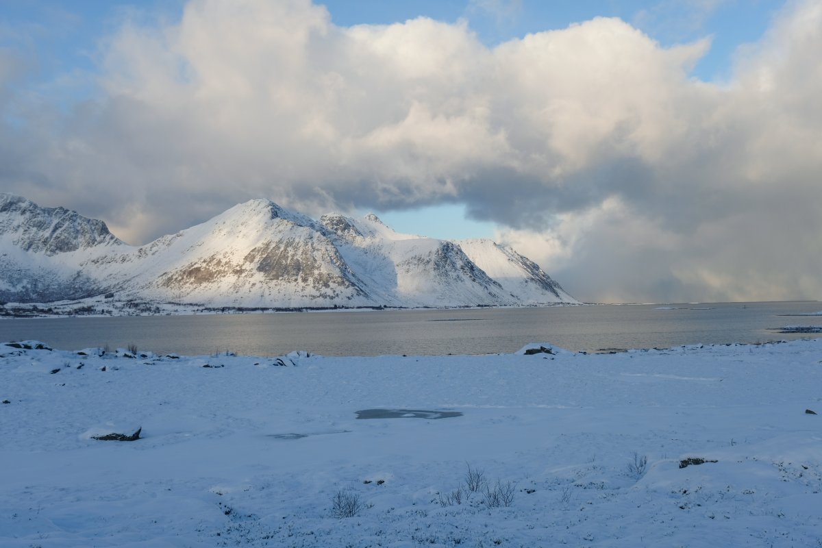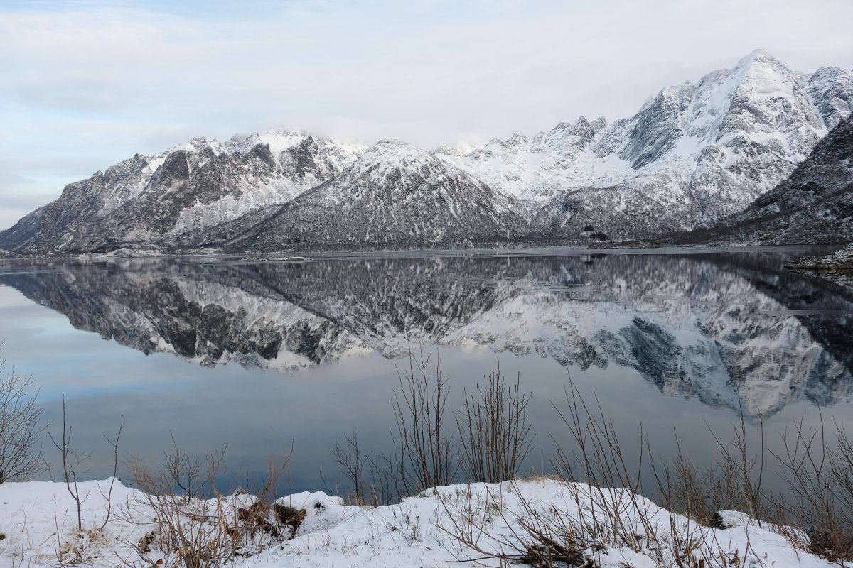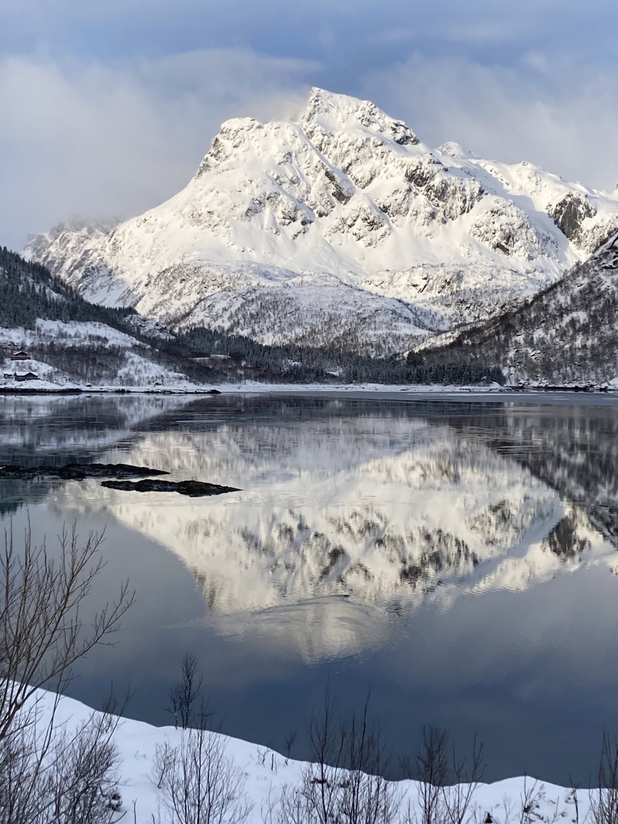 Am nächsten Tag gönnen wir uns ein hervorragendes Frühstück mit geräuchertem Fisch in dem Restaurant, während unser Auto an der Schnellladestation lädt. Diesmal ging das Anschließen flott. Wir brauchen Strom, denn wir fahren ans Ende der Welt, oder auch an den Anfang, nach Å. Dort endet die Straße, die Lofoten allerdings nicht. Bis dorthin sind es 130 km, quer über die Inseln, entlang der Fjorde. Das Wetter ist übrigens nicht gut angesagt, doch mittlerweile wissen wir, dass die Wetterapp hier versagt. Heute soll es schneien, das tut es auch, aber der überwiegende Teil des Tages ist wieder ein Lichtspiel von Sonne und Wolken. Es ist zauberhaft.