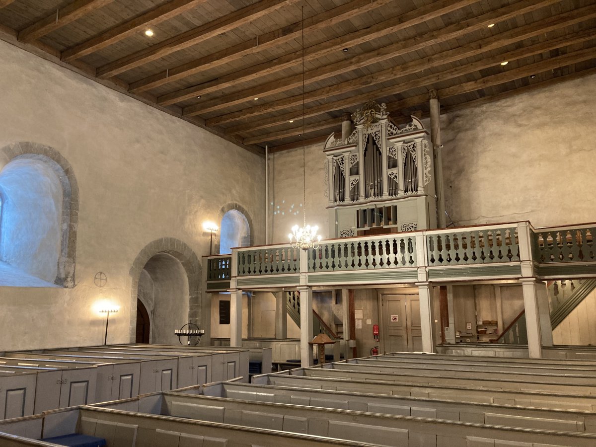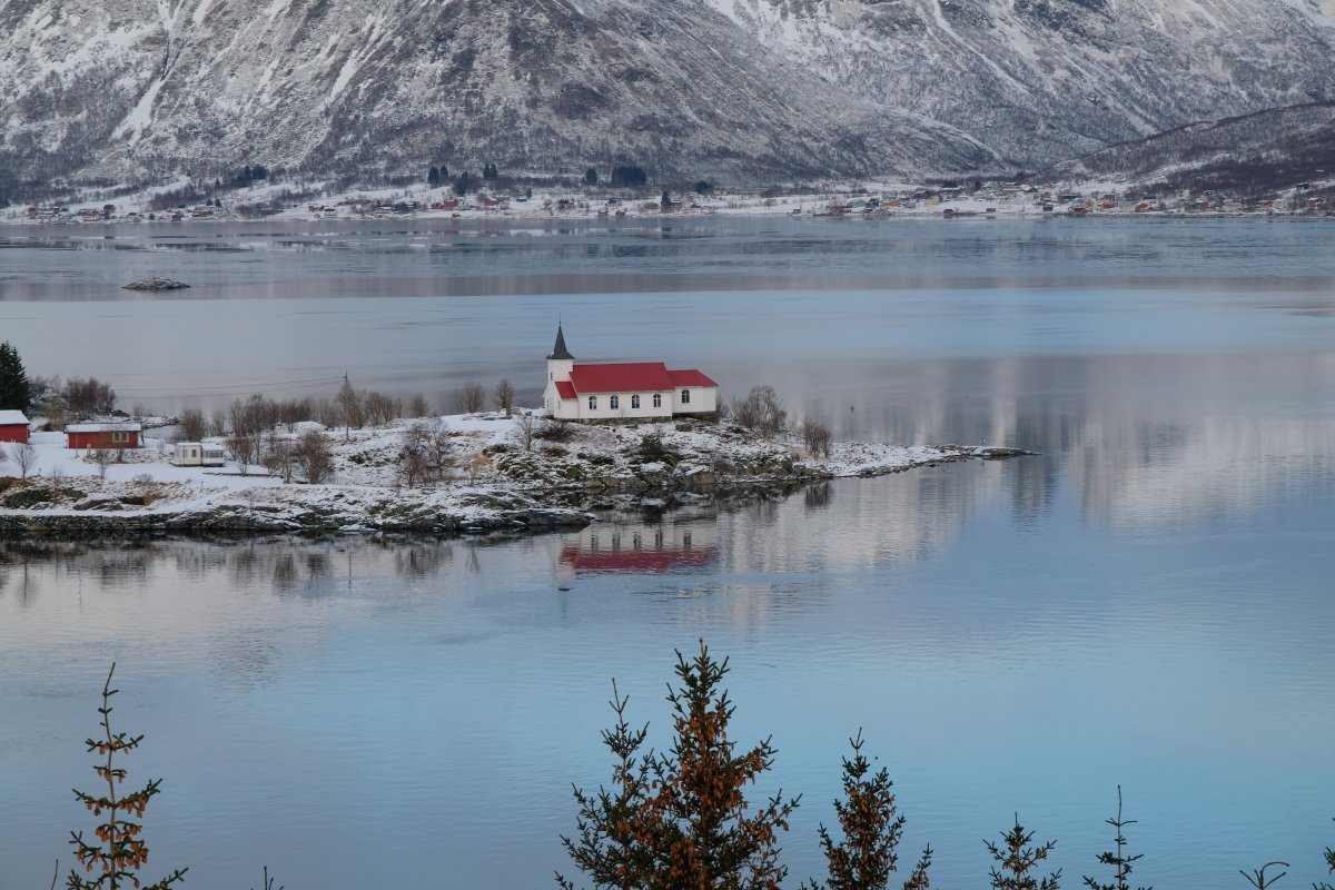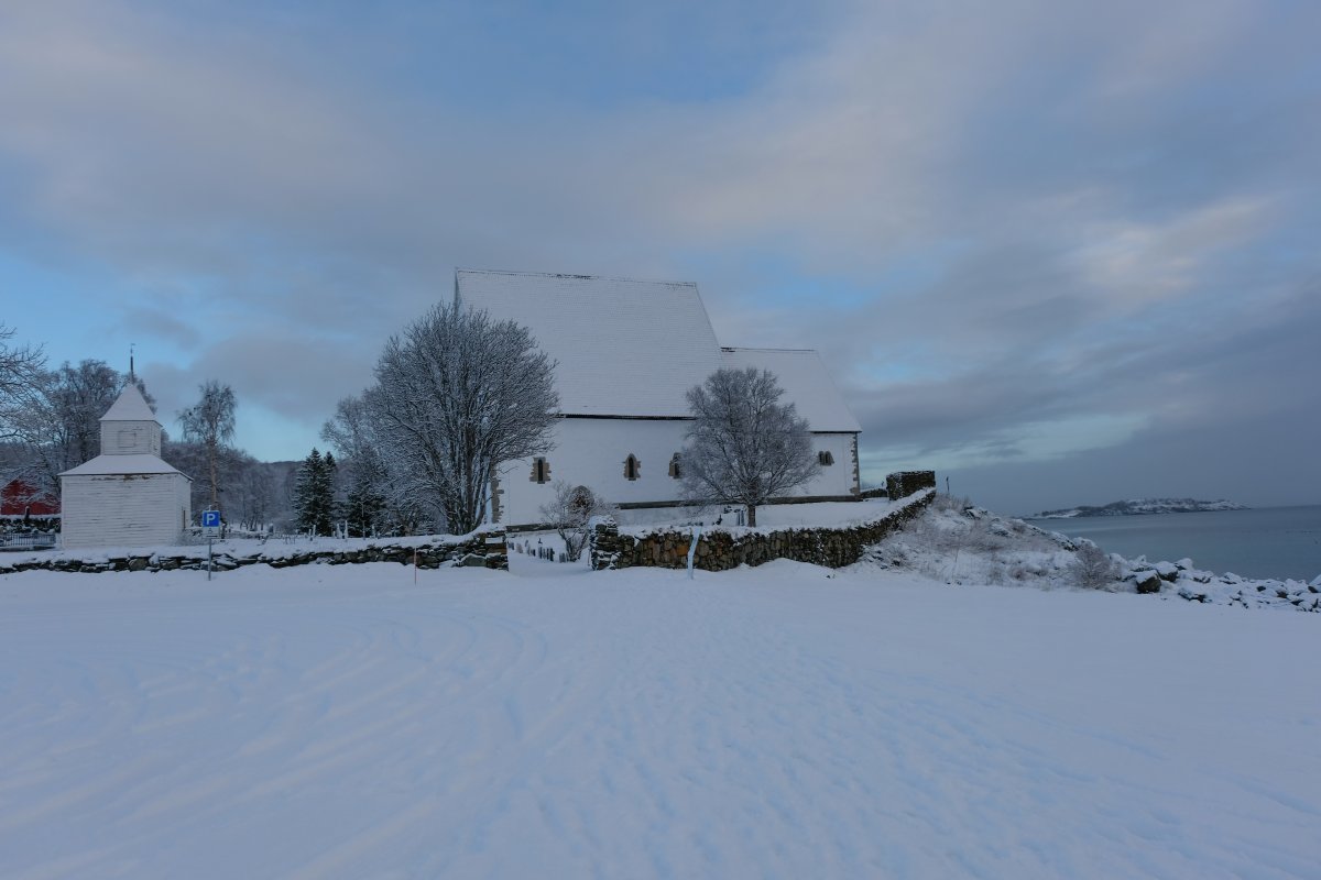 Hatte ich gestern Angst, dass es wenig Schnee geben würde? Der intensive Regen ist in der Nacht in dichtes Schneetreiben übergegangen und wir sind im Winterwonderland erwacht. Naja, nicht ganz, Harstad ist keine besonders schöne Stadt. Nach einem kurzen Rundgang (und einem längeren Aufenthalt im Wollgeschäft) fahren wir trotz Schneefalls zur einzigen Sehenswürdigkeit, dem Kircherl von Trondenes. Es schneit, die Sicht ist bescheiden, doch wir stapfen durch den Schnee zur Kirche. Die ist innen überraschend hübsch, schlicht, aber hübsch. Wir sind vielleicht 10 Minuten drinnen, doch werden wir draußen von Sonnenschein begrüßt!
