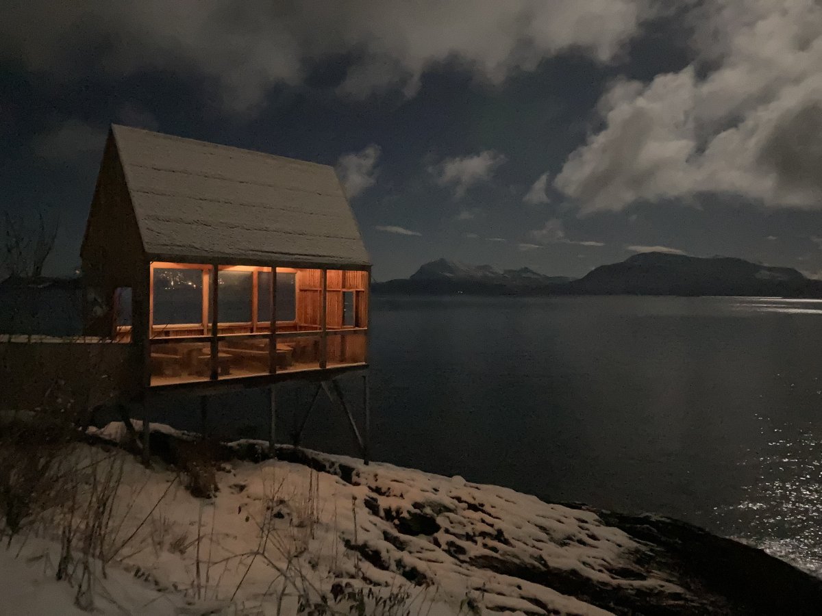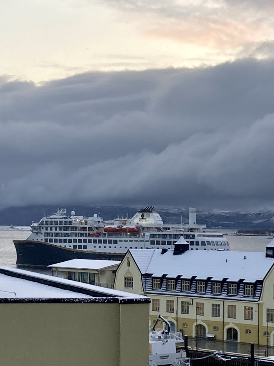 So gegen halb neun bekomme ich einen Alarm meiner Polarlicht App: Es könnte in der nächsten Stunde Polarlichter geben, zu sehen, wenn der Himmel klar ist. Das ist er nur in Teilen, mal schneit es, mal strahlt der Vollmond über der Stadt. Sich jetzt aufraffen ist gar nicht so einfach! Aber wer weiß, wie das Wetter morgen ist, also fahren wir zum unteren Parkplatz des Museums bei der Trondenes Kirche. Und genau als wir ankommen, erscheint der erste grüne Schleier am Himmel. Ziel der Reise erreicht, dieser Punkt meiner Löffelliste kann abgehakt werden!