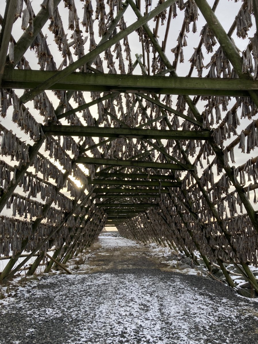 Nachmittags spazieren wir noch bis ans Ende der Inseln vor Svolvær. Endlich sehen wir nicht nur die riesigen leeren Gestelle aus Holz, die überall herumstehen. Diesmal hängen auch unzählige Fische zum Trocknen dran. Kein Anblick für zarte Gemüter und nach Fisch stinkt es auch! Trotzdem ist es ein erbaulicher Spaziergang mit einigen schönen Blicken auf den Ort.