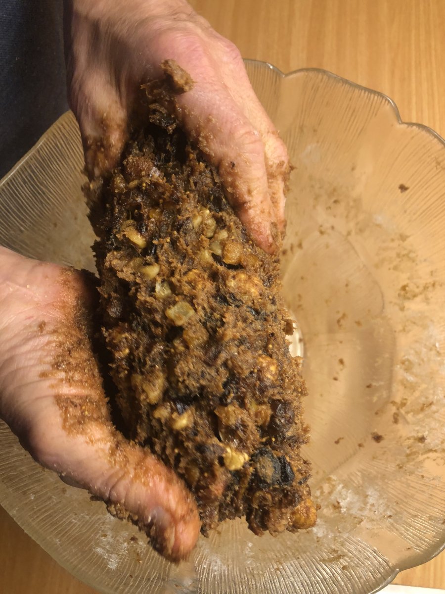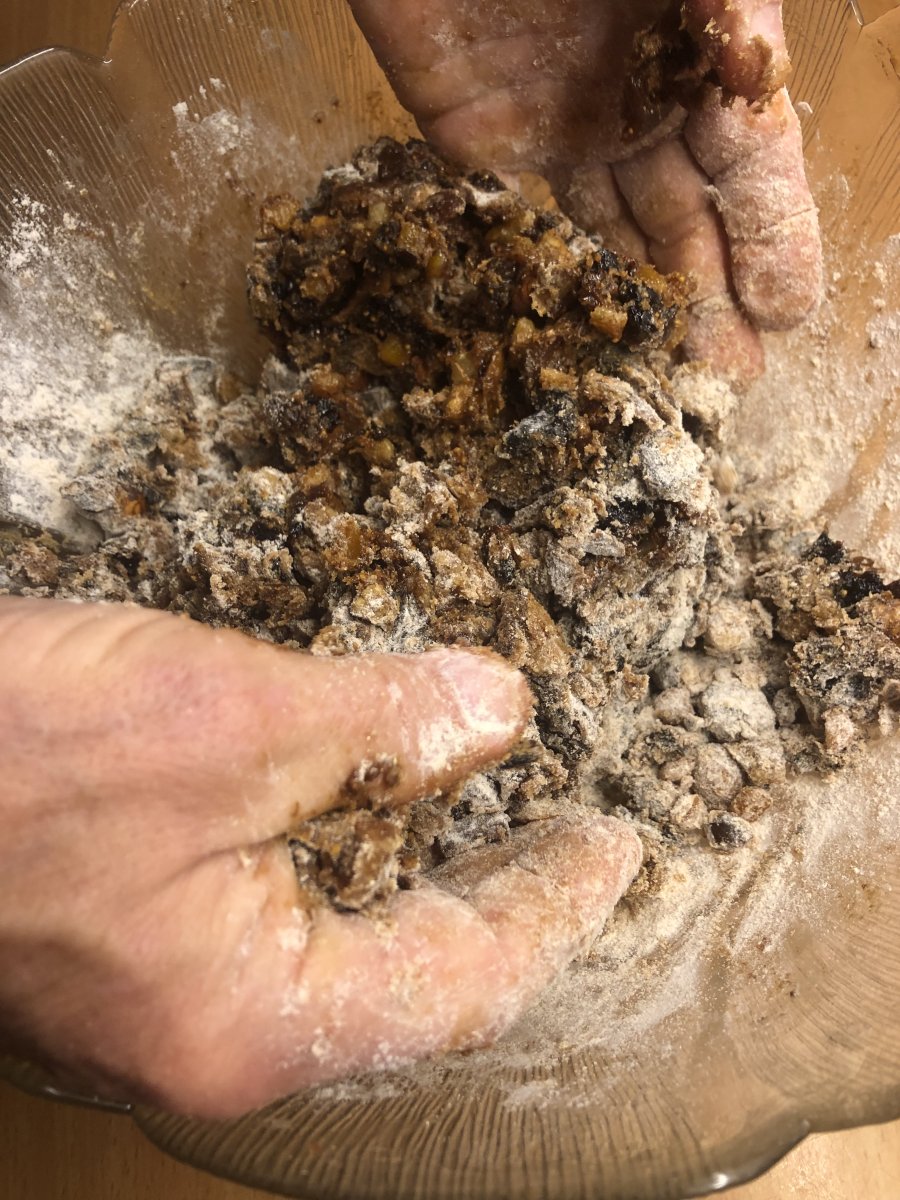 Je 25 dkg weiche Zwetschken, Feigen, waschen, abtropfen, 15 dkg Datteln, entkernt fein nudelig geschnitten, je 10 dkg Arancini, Haselnüsse, Nusskerne mit 7 dkg festen Powidl, 10 dkg abgetropften Rosinen in ein Porzellangefäß geben, würzen mit 1 1/2 Deziliter Rum, 1 Kaffeelöffel Zimt, 1 Vanillezucker, Saft und Schale einer Zitrone, 25 dkg Staubzucker, fest und glatt durcharbeiten, über Nacht stehen lassen, zugedeckt und kalt, am Tage darauf 25 dkg Mehl, gut abarbeiten, Wecken formen, auf Oblaten backen