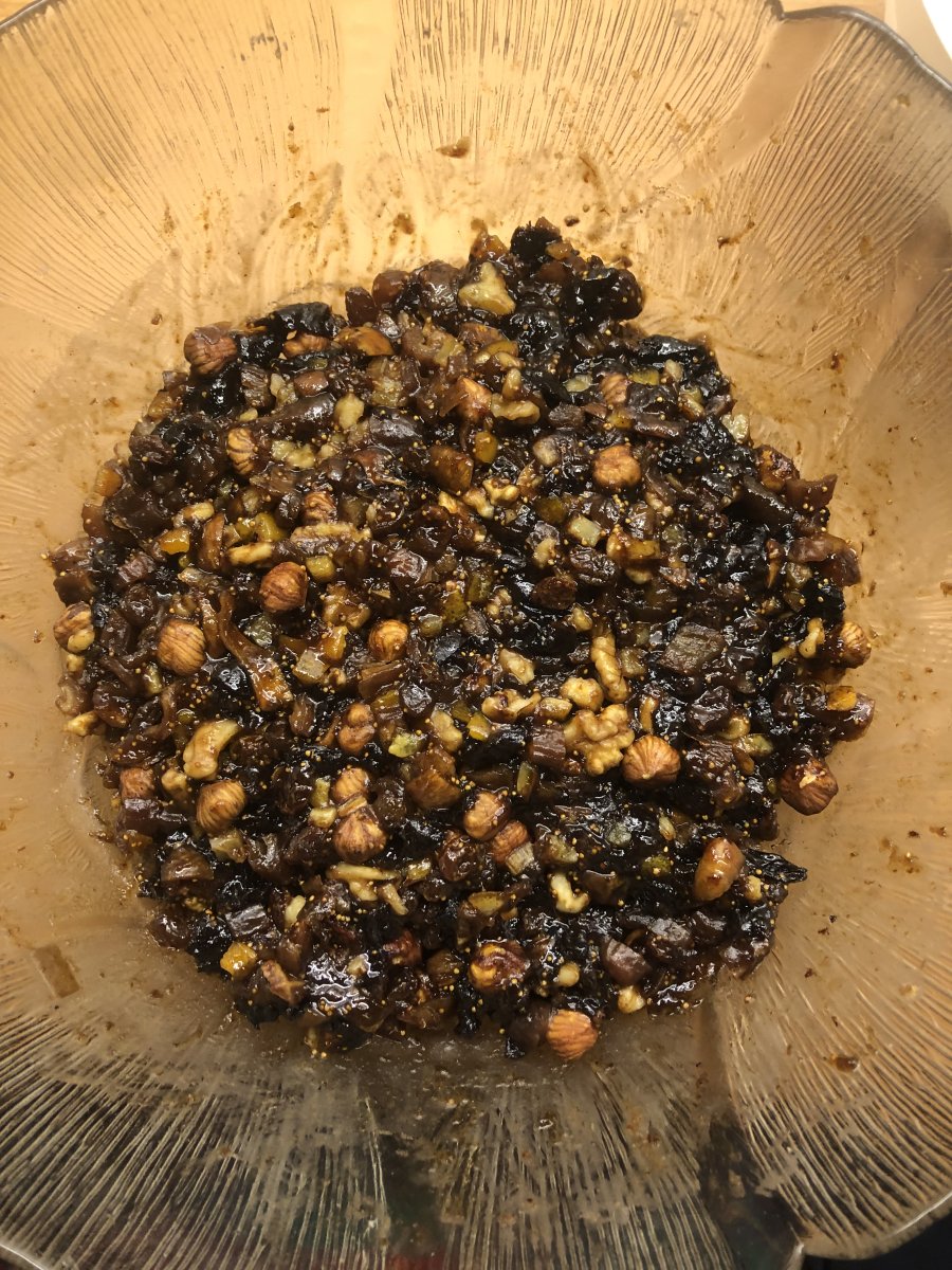 • 150 g entkernte Datteln, alles fein nudelig schneiden mischen mit