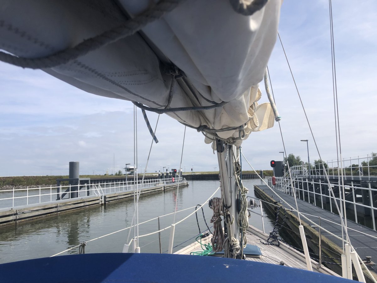 Vor der Johan Frisosluis müssen wir kurz warten, also am Wartesteiger anlegen, ich werfe vorne die Leine rüber, Tomy hinten. Theoretisch.