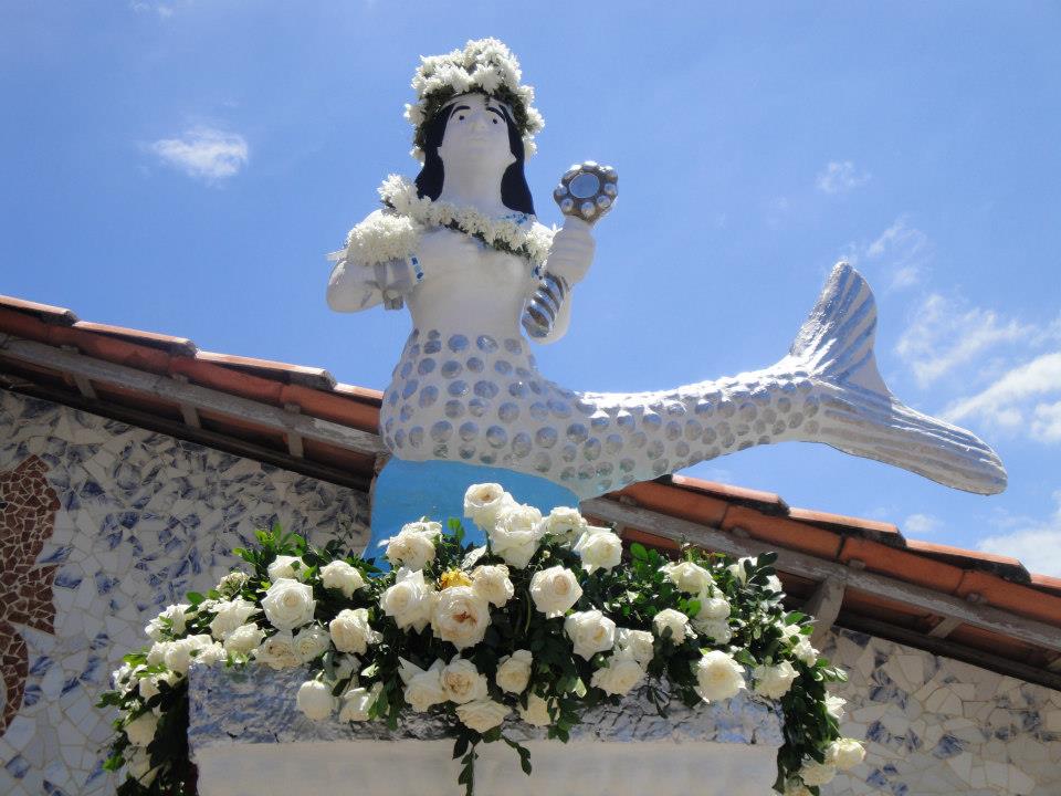 Yemanjá — Yemaya ist die Verkörperung der lebensspendenden Kraft des Meeres. Sie ist die Mutter allen Lebens, der weite Ozean, die Essenz der Mutterschaft, die Beschützerin der Kinder, die Göttin der Magie. Sie wird überall an der Küste Brasiliens verehrt, besonders in Salvador da Bahia. Im Jahre 1925 beschlossen 25 Fischer ein Fest zu ihren Ehren auszurichten. Damals gab es kaum Fische im Meer. Bis heute werden ihr am 2. Februar Opfergaben ins Meer geworfen: duftende Tuberosen und andere Blumen, Parfüm, Spiegel, Schmuck, bunte Bänder, Kämme, Kerzen, Make-up, Puppen, Champagner … Oh, ja, sie ist eine Frau!